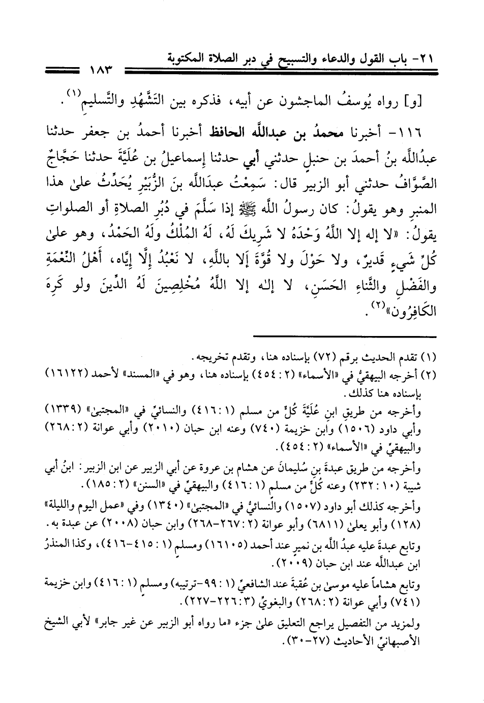 116 - أَخْبَرَنَا مُحَمَّدُ بْنُ عَبْدِ اللَّهِ الْحَافِظُ، أَخْبَرَنَا أَحْمَدُ بْنُ جَعْفَرٍ، حَدَّثَنَا عَبْدُ اللَّهِ بْنُ أَحْمَدَ بْنِ حَنْبَلٍ، حَدَّثَنِي أَبِي، حَدَّثَنَا إِسْمَاعِيلُ ابْنُ عُلَيَّةَ، حَدَّثَنَا حَجَّاجُ الصَّوَّافُ، وَحَدَّثَنِي أَبُو الزُّبَيْرِ، قَالَ: سَمِعْتُ عَبْدَ اللَّهِ بْنَ الزُّبَيْرِ، يُحَدِّثُ عَلَى هَذَا الْمِنْبَرِ وَهُوَ يَقُولُ: كَانَ رَسُولُ اللَّهِ صَلَّى اللهُ عَلَيْهِ وَسَلَّمَ " §إِذَا سَلَّمَ فِي دُبُرِ الصَّلَاةِ أَوِ الصَّلَوَاتِ يَقُولُ: «لَا إِلَهَ إِلَّا اللَّهُ، وَحْدَهُ لَا شَرِيكَ لَهُ، لَهُ الْمُلْكُ، وَلَهُ الْحَمْدُ، وَهُوَ عَلَى كُلِّ شَيْءٍ قَدِيرٌ، لَا حَوْلَ وَلَا قُوَّةَ إِلَّا بِاللَّهِ، لَا نَعْبُدُ إِلَّا إِيَّاهُ، أَهْلُ النِّعْمَةِ وَالْفَضْلِ، وَالثَّنَاءِ الْحَسَنِ، لَا إِلَهَ إِلَّا اللَّهُ، مُخْلِصِينَ لَهُ الدِّينَ، وَلَوْ كَرِهَ الْكَافِرُونَ» .