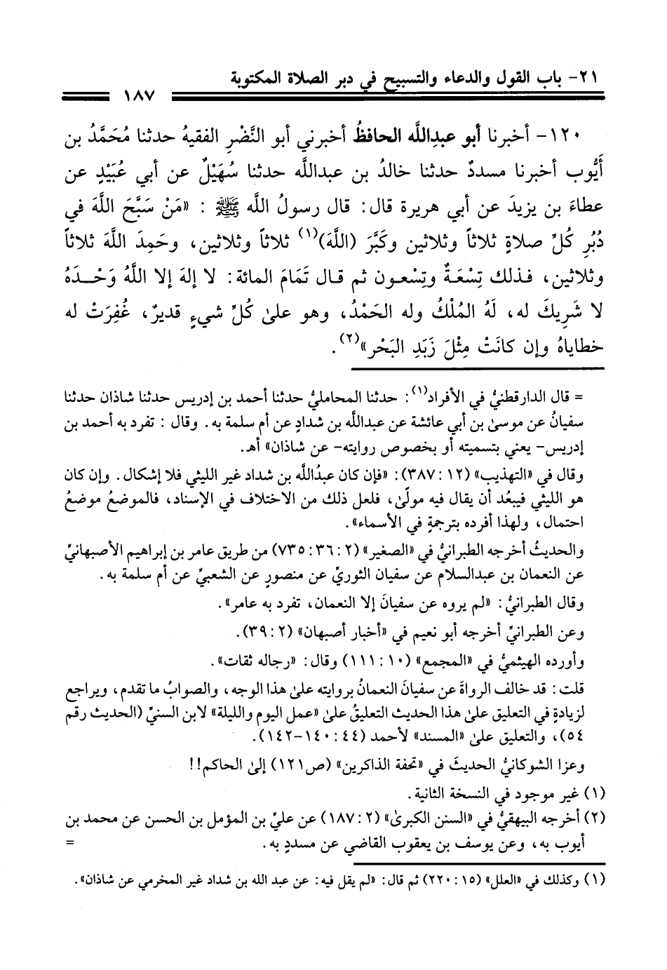 120 - أَخْبَرَنَا أَبُو عَبْدِ اللَّهِ الْحَافِظُ، أَخْبَرَنِي أَبُو النَّضْرِ الْفَقِيهُ، حَدَّثَنَا مُحَمَّدُ بْنُ أَيُّوبَ، أَخْبَرَنَا مُسَدَّدٌ، حَدَّثَنَا خَالِدُ بْنُ عَبْدِ اللَّهِ، حَدَّثَنَا سُهَيْلٌ، عَنْ أَبِي عُبَيْدٍ، عَنْ عَطَاءِ بْنِ يَزِيدَ، عَنْ أَبِي هُرَيْرَةَ، قَالَ: قَالَ رَسُولُ اللَّهِ صَلَّى اللهُ عَلَيْهِ وَسَلَّمَ: " §مَنْ سَبَّحَ اللَّهَ فِي دُبُرِ كُلِّ صَلَاةٍ ثَلَاثًا وَثَلَاثِينَ، وَكَبَّرَ ثَلَاثًا وَثَلَاثِينَ، وَحَمِدَ ثَلَاثًا وَثَلَاثِينَ، فَذَلِكَ تِسْعَةٌ وَتِسْعُونَ، ثُمَّ قَالَ تَمَامَ الْمِائَةِ: لَا إِلَهَ إِلَّا اللَّهُ، وَحْدَهُ لَا شَرِيكَ لَهُ، لَهُ الْمُلْكُ، وَلَهُ الْحَمْدُ، وَهُوَ عَلَى كُلِّ شَيْءٍ قَدِيرٌ، غُفِرَتْ لَهُ خَطَايَاهُ، وَإِنْ كَانَتْ مِثْلُ زَبَدِ الْبَحْرِ "