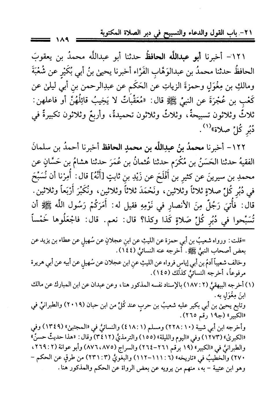 121 - أَخْبَرَنَا أَبُو عَبْدِ اللَّهِ الْحَافِظُ، حَدَّثَنَا أَبُو عَبْدِ اللَّهِ مُحَمَّدُ بْنُ يَعْقُوبَ الْحَافِظُ، حَدَّثَنَا مُحَمَّدُ بْنُ عَبْدِ الْوَهَّابِ الْفَرَّاءُ، أَخْبَرَنَا يَحْيَى بْنُ أَبِي بُكَيْرٍ، عَنْ شُعْبَةَ، وَمَالِكِ بْنِ مِغْوَلٍ، وَحَمْزَةَ الزَّيَّاتِ، عَنِ الْحَكَمِ، عَنْ عَبْدِ الرَّحْمَنِ بْنِ أَبِي لَيْلَى، عَنْ كَعْبِ بْنِ عُجْرَةَ، عَنِ النَّبِيِّ صَلَّى اللهُ عَلَيْهِ وَسَلَّمَ قَالَ: " §مُعَقِّبَاتٌ لَا يَخِيبُ قَائِلُهُنَّ أَوْ فَاعِلُهُنَّ: ثَلَاثٌ وَثَلَاثُونَ تَسْبِيحَةً، وَثَلَاثٌ وَثَلَاثُونَ تَحْمِيدَةً، وَأَرْبَعٌ وَثَلَاثُونَ تَكْبِيرَةً، فِي دُبُرِ كُلِّ صَلَاةٍ "
