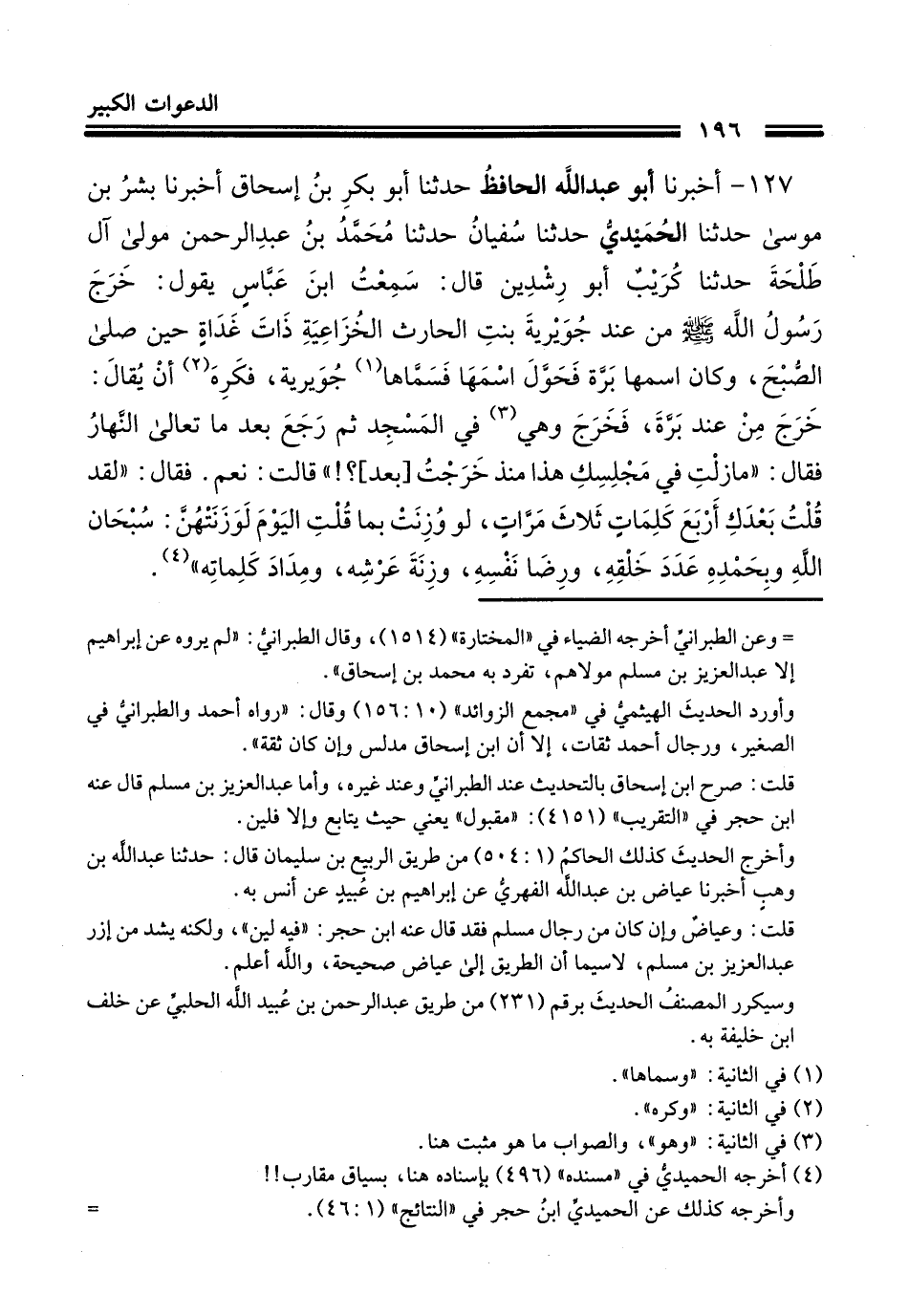 127 - أَخْبَرَنَا أَبُو عَبْدِ اللَّهِ الْحَافِظُ، حَدَّثَنَا أَبُو بَكْرِ بْنُ إِسْحَاقَ، أَخْبَرَنَا بِشْرُ بْنُ مُوسَى، حَدَّثَنَا الْحُمَيْدِيُّ، حَدَّثَنَا سُفْيَانُ، حَدَّثَنَا مُحَمَّدُ بْنُ عَبْدِ الرَّحْمَنِ مَوْلَى آلِ طَلْحَةَ، حَدَّثَنَا كُرَيْبٌ أَبُو رِشْدِينَ، قَالَ: سَمِعْتُ ابْنَ عَبَّاسٍ، يَقُولُ: خَرَجَ رَسُولُ اللَّهِ صَلَّى اللهُ عَلَيْهِ وَسَلَّمَ مِنْ عِنْدِ جُوَيْرِيَةَ بِنْتِ الْحَارِثِ الْخُزَاعِيَّةِ ذَاتَ غَدَاةٍ حِينَ صَلَّى الصُّبْحَ، وَكَانَ اسْمُهَا بَرَّةَ، فَحَوَّلَ اسْمَهَا وَسَمَّاهَا جُوَيْرِيَةَ، وَكَرِهَ أَنْ يُقَالَ خَرَجَ مِنْ عِنْدِ بَرَّةَ، فَخَرَجَ وَهُوَ فِي الْمَسْجِدِ، ثُمَّ رَجَعَ بَعْدَ مَا تَعَالَى النَّهَارُ، فَقَالَ: §«مَا زِلْتِ فِي مَجْلِسِكَ هَذَا مُنْذُ خَرَجْتُ بَعْدُ؟» قَالَتْ: نَعَمْ، فَقَالَ: " لَقَدْ قُلْتُ بَعْدَكِ أَرْبَعَ كَلِمَاتٍ ثَلَاثَ مَرَّاتٍ، لَوْ وُزِنَتْ بِمَا قُلْتِ الْيَوْمَ لَوَزَنَتْهُنَّ: سُبْحَانَ اللَّهِ وَبِحَمْدِهِ عَدَدَ خَلْقِهِ، وَرِضَا نَفْسِهِ، وَزِنَةَ عَرْشِهِ، وَمِدَادَ كَلِمَاتِهِ "