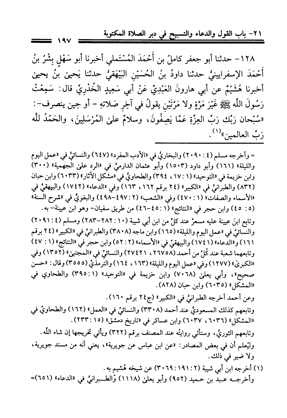 128 - حَدَّثَنَا أَبُو جَعْفَرٍ كَامِلُ بْنُ أَحْمَدَ الْمُسْتَمْلِي أَخْبَرَنَا أَبُو سَهْلٍ بِشْرُ بْنُ أَحْمَدَ الْإِسْفَرَايِينِيُّ، حَدَّثَنَا دَاوُدُ بْنُ الْحُسَيْنِ الْبَيْهَقِيُّ، حَدَّثَنَا يَحْيَى بْنُ يَحْيَى، حَدَّثَنَا هُشَيْمٌ، عَنْ أَبِي هَارُونَ الْعَبْدِيِّ، عَنْ أَبِي سَعِيدٍ الْخُدْرِيِّ، قَالَ: سَمِعْتُ رَسُولَ اللَّهِ صَلَّى اللهُ عَلَيْهِ وَسَلَّمَ غَيْرَ مَرَّةٍ وَلَا مَرَّتَيْنِ يَقُولُ فِي آخِرِ صَلَاتِهِ - أَوْ حِينَ يَنْصَرِفُ - «§سُبْحَانَ رَبِّكَ رَبِّ الْعِزَّةِ عَمَّا يَصِفُونَ، وَسَلَامٌ عَلَى الْمُرْسَلِينَ، وَالْحَمْدُ لِلَّهِ رَبِّ الْعَالَمِينَ»