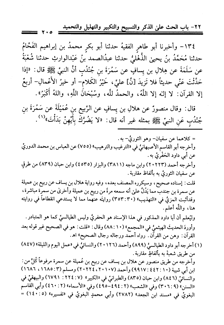 134 - وَأَخْبَرَنَا أَبُو طَاهِرٍ الْفَقِيهُ، أَخْبَرَنَا أَبُو بَكْرٍ مُحَمَّدُ بْنُ إِبْرَاهِيمَ الْفَحَّامُ، حَدَّثَنَا مُحَمَّدُ بْنُ يَحْيَى الذُّهْلِيُّ، حَدَّثَنَا عَبْدُ الصَّمَدِ بْنُ عَبْدِ الْوَارِثِ، حَدَّثَنَا شُعْبَةُ، عَنْ سَلَمَةَ، عَنْ هِلَالِ بْنِ يَسَافٍ، عَنْ سَمُرَةَ بْنِ جُنْدُبٍ، أَنَّ النَّبِيَّ صَلَّى اللهُ عَلَيْهِ وَسَلَّمَ قَالَ: " §إِذَا حَدَّثْتَ عَنِّي حَدِيثًا فَلَا تَزِيدَنَّ عَلَيَّ، خَيْرُ الْكَلَامِ، أَوْ خَيْرُ الْأَعْمَالِ أَرْبَعٌ إِلَّا الْقُرْآنَ: لَا إِلَهَ إِلَّا اللَّهُ، وَالْحَمْدُ لِلَّهِ، وَسُبْحَانَ اللَّهِ، وَاللَّهُ أَكْبَرُ " قَالَ: وَقَالَ مَنْصُورٌ، عَنْ هِلَالِ بْنِ يَسَافٍ، عَنْ رَبِيعِ بْنِ عَمِيلَةَ، عَنْ سَمُرَةَ بْنِ جُنْدُبٍ، عَنِ النَّبِيِّ صَلَّى اللهُ عَلَيْهِ وَسَلَّمَ بِمِثْلِهِ غَيْرَ أَنَّهُ قَالَ: «لَا يَضُرُّكُ بِأَيِّهِنَّ بَدَأْتَ»