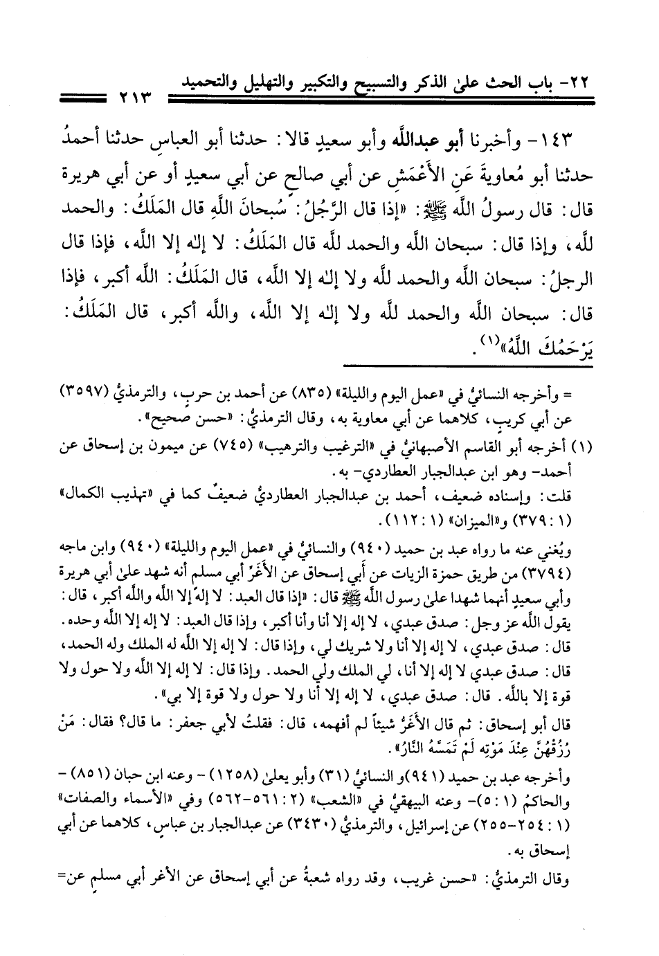 143 - وَأَخْبَرَنَا أَبُو عَبْدِ اللَّهِ، وَأَبُو سَعِيدٍ قَالَا: حَدَّثَنَا أَبُو الْعَبَّاسِ، حَدَّثَنَا أَحْمَدُ، حَدَّثَنَا أَبُو مُعَاوِيَةَ، عَنِ الْأَعْمَشِ، عَنْ أَبِي صَالِحٍ، عَنْ أَبِي سَعِيدٍ، أَوْ عَنْ أَبِي هُرَيْرَةَ، قَالَ: قَالَ رَسُولُ اللَّهِ صَلَّى اللهُ عَلَيْهِ وَسَلَّمَ: " §إِذَا قَالَ الرَّجُلُ: سُبْحَانَ اللَّهِ، قَالَ الْمَلَكُ: الْحَمْدُ لِلَّهِ، فَإِذَا قَالَ. . . .: قَالَ الْمَلَكُ: لَا إِلَهَ إِلَّا اللَّهُ، فَإِذَا قَالَ الرَّجُلُ: سُبْحَانَ اللَّهِ وَالْحَمْدُ لِلَّهِ، وَلَا إِلَهَ إِلَّا اللَّهُ، قَالَ الْمَلَكُ:. . . . . وَلَا إِلَهَ إِلَّا اللَّهُ، وَاللَّهُ أَكْبَرُ، قَالَ الْمَلَكُ: يَرْحَمُكَ اللَّهُ "