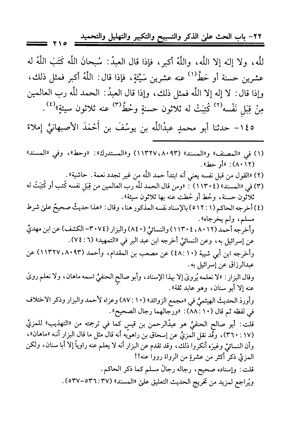 145 - حَدَّثَنَا أَبُو مُحَمَّدٍ عَبْدُ اللَّهِ بْنُ يُوسُفَ بْنِ أَحْمَدَ الْأَصْبَهَانِيُّ، إِمْلَاءً، أَخْبَرَنَا أَبُو بَكْرٍ أَحْمَدُ بْنُ إِسْحَاقَ بْنِ أَيُّوبَ، أَخْبَرَنَا مُحَمَّدُ بْنُ عِيسَى بْنِ السَّكَنِ، حَدَّثَنَا عَفَّانُ بْنُ مُسْلِمٍ، حَدَّثَنَا أَبَانُ بْنُ يَزِيدَ، عَنْ يَحْيَى بْنِ أَبِي كَثِيرٍ، عَنْ زَيْدِ بْنِ سَلَّامٍ، عَنْ أَبِي سَلَّامٍ، عَنْ أَبِي مَالِكٍ الْأَشْعَرِيِّ، عَنِ النَّبِيِّ صَلَّى اللهُ عَلَيْهِ وَسَلَّمَ أَنَّهُ كَانَ يَقُولُ: «§الطُّهُورُ شَطْرُ الْإِيمَانِ، وَالْحَمْدُ لِلَّهِ تَمْلَأُ الْمِيزَانَ، وَسُبْحَانَ اللَّهِ، وَاللَّهُ أَكْبَرُ، تَمْلَأُ مَا بَيْنَ السَّمَاءِ وَالْأَرْضِ، وَالصَّلَاةُ نُورٌ، وَالصَّدَقَةُ بُرْهَانٌ، وَالصَّبْرُ ضِيَاءٌ، وَالْقُرْآنُ حُجَّةٌ لَكَ أَوْ عَلَيْكَ، وَالنَّاسُ يَغْدُونَ، فَبَايِعٌ نَفْسَهُ فَمُوبِقُهَا، أَوْ مُبْتَاعٌ فَمُعْتِقُهَا»