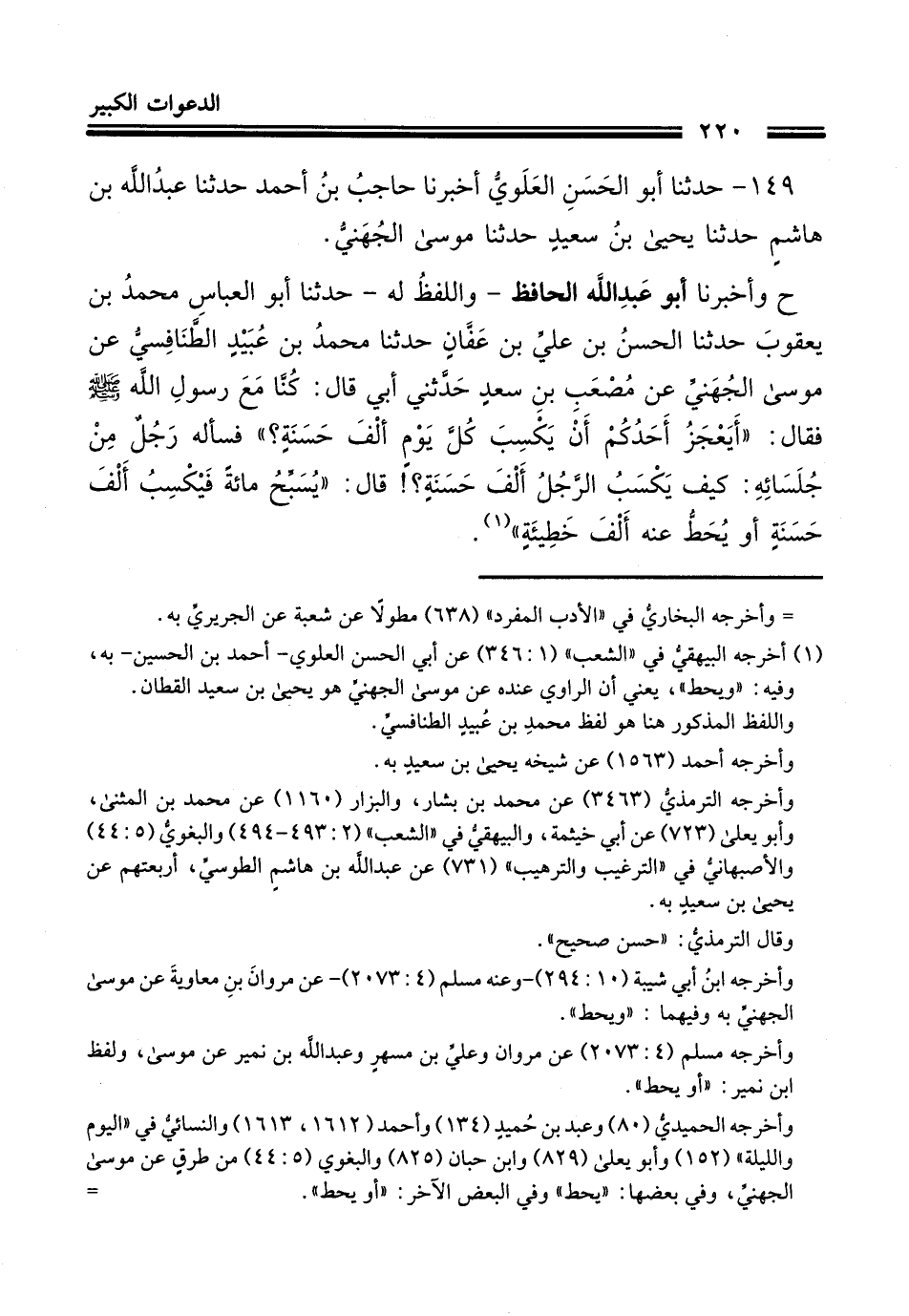 149 - حَدَّثَنَا أَبُو الْحَسَنِ الْعَلَوِيُّ، أَخْبَرَنَا حَاجِبُ بْنُ أَحْمَدَ، حَدَّثَنَا عَبْدُ اللَّهِ بْنُ هَاشِمٍ، حَدَّثَنَا يَحْيَى بْنُ سَعِيدٍ، حَدَّثَنَا مُوسَى الْجُهَنِيُّ، وَأَخْبَرَنَا أَبُو عَبْدِ اللَّهِ، وَاللَّفْظُ، لَهُ، حَدَّثَنَا أَبُو الْعَبَّاسِ مُحَمَّدُ بْنُ يَعْقُوبَ، حَدَّثَنَا الْحَسَنُ بْنُ عَلِيِّ بْنِ عَفَّانَ، حَدَّثَنَا مُحَمَّدُ بْنُ عُبَيْدٍ الطَّنَافِسِيُّ، عَنْ مُوسَى الْجُهَنِيُّ، عَنْ مُصْعَبِ بْنِ سَعْدٍ، حَدَّثَنِي أَبِي قَالَ،: كُنَّا مَعَ رَسُولِ اللَّهِ صَلَّى اللهُ عَلَيْهِ وَسَلَّمَ فَقَالَ: §«أَيَعْجَزُ أَحَدُكُمْ أَنْ يَكْسِبَ كُلَّ يَوْمٍ أَلْفَ حَسَنَةٍ؟» فَسَأَلَهُ رَجُلٌ مِنْ جُلَسَائِهِ: كَيْفَ يَكْسِبُ الرَّجُلُ أَلْفَ حَسَنَةَ؟ قَالَ: «يُسَبِّحُ مِائَةً فَيَكْسِبُ أَلْفَ حَسَنَةٍ، أَوْ يُحَطُّ عَنْهُ أَلْفُ خَطِيئَةٍ»