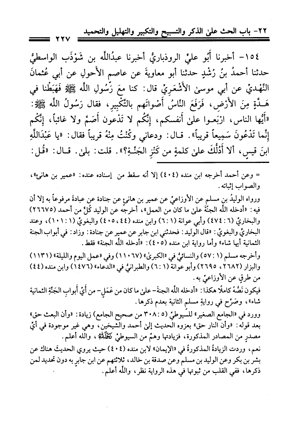 154 - أَخْبَرَنَا أَبُو عَلِيٍّ الرُّوذْبَارِيُّ، أَخْبَرَنَا عَبْدُ اللَّهِ بْنُ شَوْذَبٍ الْوَاسِطِيُّ، حَدَّثَنَا أَحْمَدُ بْنُ رَشَدٍ، حَدَّثَنَا أَبُو مُعَاوِيَةَ، عَنْ عَاصِمٍ الْأَحْوَلِ، عَنْ أَبِي عُثْمَانَ النَّهْدِيِّ، عَنْ أَبِي مُوسَى الْأَشْعَرِيِّ، قَالَ: كُنَّا مَعَ رَسُولِ اللَّهِ صَلَّى اللهُ عَلَيْهِ وَسَلَّمَ فَهَبَطْنَا فِي هَدَّةٍ مِنَ الْأَرْضِ، فَرَفَعَ النَّاسُ أَصْوَاتَهُمْ بِالتَّكْبِيرِ، فَقَالَ رَسُولُ اللَّهِ صَلَّى اللهُ عَلَيْهِ وَسَلَّمَ: «أَيُّهَا النَّاسُ، §أرْبِعُوا عَلَى أَنْفُسِكُمْ، إِنَّكُمْ لَا تَدْعُونَ أَصَمَّ وَلَا غَائِبًا، إِنَّكُمْ إِنَّمَا تَدْعُونَ سَمِيعًا قَرِيبًا» قَالَ: وَدَعَانِي وَكُنْتُ مِنْهُ قَرِيبًا، فَقَالَ: «يَا عَبْدَ اللَّهِ بْنَ قَيْسٍ، أَلَا أَدُلُّكَ عَلَى كَلِمَةٍ مِنْ كَنْزِ الْجَنَّةِ؟» قُلْتُ: بَلَى، قَالَ " قُلْ: لَا حَوْلَ وَلَا قُوَّةَ إِلَّا بِاللَّهِ "