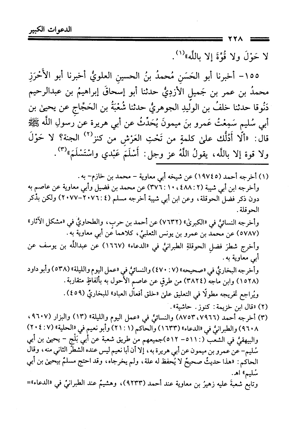 155 - أَخْبَرَنَا أَبُو الْحَسَنِ مُحَمَّدُ بْنُ الْحُسَيْنِ الْعَلَوِيُّ أَخْبَرَنَا أَبُو الْأَحْرَزِ مُحَمَّدُ بْنُ عُمَرَ بْنُ جَمِيلٍ الْأَزْدِيُّ، حَدَّثَنَا أَبُو إِسْحَاقَ إِبْرَاهِيمُ بْنُ عَبْدِ الرَّحِيمِ دَنُوقًا، حَدَّثَنَا خَلَفُ بْنُ الْوَلِيدِ الْجَوْهَرِيُّ، حَدَّثَنَا شُعْبَةُ بْنُ الْحَجَّاجِ، عَنْ يَحْيَى بْنِ أَبِي سُلَيْمٍ، سَمِعْتُ عَمْرَو بْنَ مَيْمُونٍ، يُحَدِّثُ، عَنْ أَبِي هُرَيْرَةَ، عَنْ رَسُولِ اللَّهِ صَلَّى اللهُ عَلَيْهِ وَسَلَّمَ قَالَ: §" أَلَا أَدُلُّكَ عَلَى كَلِمَةٍ مِنْ تَحْتِ الْعَرْشِ مِنْ كَنْزِ الْجَنَّةِ؟ لَا حَوْلَ وَلَا قُوَّةَ إِلَّا بِاللَّهِ، وَيَقُولُ اللَّهُ عَزَّ وَجَلَّ: أَسْلَمَ عَبْدِي وَاسْتَسْلَمَ "