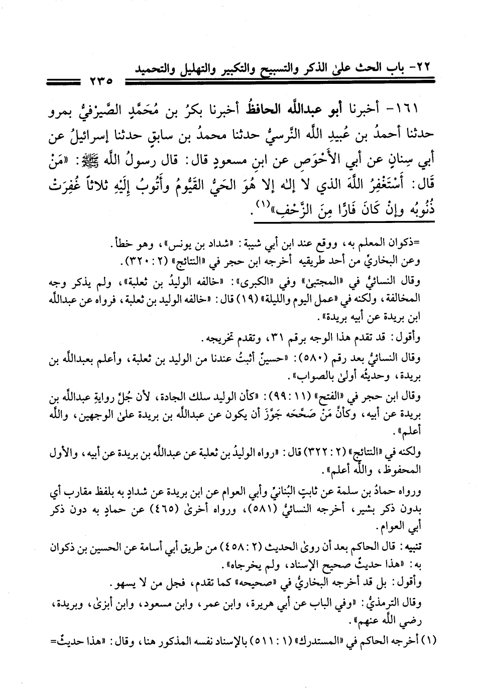 161 - أَخْبَرَنَا أَبُو عَبْدِ اللَّهِ الْحَافِظُ، أَخْبَرَنَا بَكْرُ بْنُ مُحَمَّدِ الصَّيْرَفِيُّ، بِمَرْوَ، حَدَّثَنَا أَحْمَدُ بْنُ عُبَيْدِ اللَّهِ النَّرْسِيُّ، حَدَّثَنَا مُحَمَّدُ بْنُ سَابِقٍ، حَدَّثَنَا إِسْرَائِيلُ، عَنْ أَبِي سِنَانٍ، عَنْ أَبِي الْأَحْوَصِ، عَنِ ابْنِ مَسْعُودٍ، قَالَ: قَالَ رَسُولُ اللَّهِ صَلَّى اللهُ عَلَيْهِ وَسَلَّمَ: " §مَنْ قَالَ: أَسْتَغْفِرُ اللَّهَ الَّذِي لَا إِلَهَ إِلَّا هُوَ الْحَيُّ الْقَيُّومُ، وَأَتُوبُ إِلَيْهِ، ثَلَاثًا، غُفِرَتْ ذُنُوبُهُ وَإِنْ كَانَ فَارًّا مِنَ الزَّحْفِ "