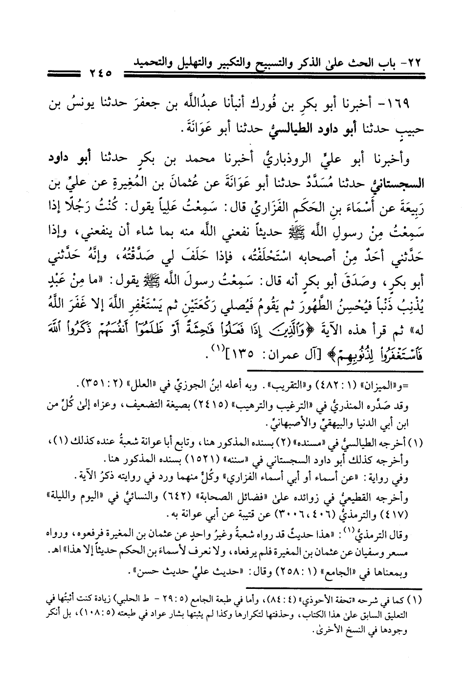 169 - أَخْبَرَنَا أَبُو بَكْرِ بْنُ فُورَكٍ، أَنْبَأَنَا عَبْدُ اللَّهِ بْنُ جَعْفَرٍ، حَدَّثَنَا يُونُسُ بْنُ حَبِيبٍ، حَدَّثَنَا أَبُو دَاوُدَ الطَّيَالِيسِيُّ، حَدَّثَنَا أَبُو عَوَانَةَ، وَأَخْبَرَنَا أَبُو عَلِيٍّ الرُّوذْبَارِيُّ، أَخْبَرَنَا مُحَمَّدُ بْنُ بَكْرٍ، حَدَّثَنَا أَبُو دَاوُدَ السِّجِسْتَانِيُّ، حَدَّثَنَا مُسَدَّدٌ، حَدَّثَنَا أَبُو عَوَانَةَ، عَنْ عُثْمَانَ بْنِ الْمُغِيرَةِ، عَنْ عَلِيِّ بْنِ رَبِيعَةَ، عَنْ أَسْمَاءِ بْنِ الْحَكَمِ الْفَزَارِيِّ، قَالَ: سَمِعْتُ عَلِيًّا، يَقُولُ: كُنْتُ رَجُلًا إِذَا سَمِعْتُ مِنْ رَسُولِ اللَّهِ صَلَّى اللهُ عَلَيْهِ وَسَلَّمَ حَدِيثًا نَفَعَنِي اللَّهُ مِنْهُ بِمَا شَاءَ أَنْ يَنْفَعَنِي، وَإِذَا حَدَّثَنِي أَحَدٌ مِنْ أَصْحَابِهِ اسْتَحْلَفْتُهُ، فَإِذَا حَلَفَ لِي صَدَّقْتُهُ، وَإِنَّهُ حَدَّثَنِي أَبُو بَكْرٍ، وَصَدَقَ أَبُو بَكْرٍ، أَنَّهُ قَالَ: سَمِعْتُ رَسُولَ اللَّهِ صَلَّى اللهُ عَلَيْهِ وَسَلَّمَ يَقُولُ: " §مَا مِنْ عَبْدٍ يُذْنِبُ ذَنْبًا فَيُحْسِنُ الطُّهُورُ، ثُمَّ يَقُومُ فَيُصَلِّي رَكْعَتَيْنِ، ثُمَّ يَسْتَغْفِرُ اللَّهَ إِلَّا غَفَرَ اللَّهُ لَهُ، ثُمَّ قَرَأَ هَذِهِ الْآيَةَ {وَالَّذِينَ إِذَا فَعَلُوا فَاحِشَةً أَوْ ظَلَمُوا أَنْفُسَهُمْ ذَكَرُوا اللَّهَ فَاسْتَغْفَرُوا لِذُنُوبِهِمْ} [آل عمران: 135] الْآيَةَ