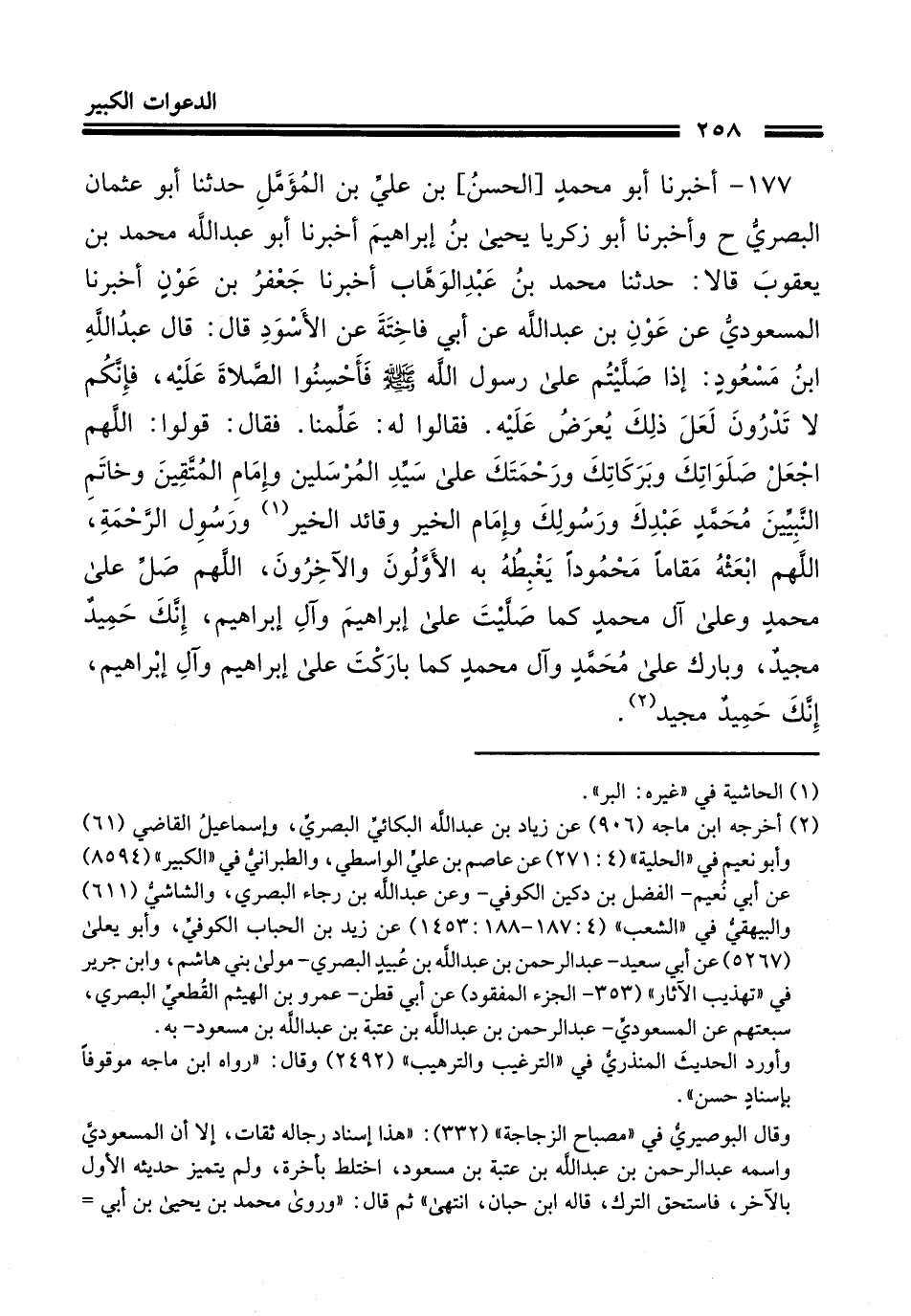 177 - أَخْبَرَنَا أَبُو مُحَمَّدٍ الْحَسَنُ بْنُ عَلِيِّ بْنِ الْمُؤَمَّلِ، حَدَّثَنَا أَبُو عُثْمَانَ الْبَصْرِيُّ ح، وَأَخْبَرَنَا أَبُو زَكَرِيَّا يَحْيَى بْنُ إِبْرَاهِيمَ، أَخْبَرَنَا أَبُو عَبْدِ اللَّهِ مُحَمَّدُ بْنُ يَعْقُوبَ قَالَا: حَدَّثَنَا مُحَمَّدُ بْنُ عَبْدِ الْوَهَّابِ، أَخْبَرَنَا جَعْفَرُ بْنُ عَوْنٍ، أَخْبَرَنَا الْمَسْعُودِيُّ، عَنْ عَوْنِ بْنِ عَبْدِ اللَّهِ، عَنْ أَبِي فَاخِتَةَ، عَنِ الْأَسْوَدِ، قَالَ: قَالَ عَبْدُ اللَّهِ بْنُ مَسْعُودٍ: §" إِذَا صَلَّيْتُمْ عَلَى رَسُولِ اللَّهِ صَلَّى اللهُ عَلَيْهِ وَسَلَّمَ فَأَحْسِنُوا الصَّلَاةَ عَلَيْهِ، فَإِنَّكُمْ لَا تَدْرُونَ لَعَلَّ ذَلِكَ يُعْرَضُ عَلَيْهِ، فَقَالُوا لَهُ: عَلِّمْنَا، فَقَالَ: " قُولُوا: اللَّهُمَّ اجْعَلْ صَلَوَاتِكَ وَبَرَكَاتِكَ وَرَحْمَتَكَ عَلَى سَيِّدِ الْمُرْسَلِينَ، وَإِمَامِ الْمُتَّقِينَ، وَخَاتَمِ النَّبِيِّينَ، مُحَمَّدٍ عَبْدِكَ وَرَسُولِكَ، إِمَامِ الْخَيْرِ، وَقَائِدِ الْخَيْرِ، وَرَسُولِ الرَّحْمَةِ، اللَّهُمَّ ابْعَثْهُ مَقَامًا مَحْمُودًا يَغْبِطُهُ بِهِ الْأَوَّلُونَ وَالْآخِرُونَ، اللَّهُمَّ صَلِّ عَلَى مُحَمَّدٍ وَعَلَى آلِ مُحَمَّدٍ كَمَا صَلَّيْتَ عَلَى إِبْرَاهِيمَ وَآلِ إِبْرَاهِيمَ إِنَّكَ حَمِيدٌ مَجِيدٌ، وَبَارِكْ عَلَى مُحَمَّدٍ وَآلِ مُحَمَّدٍ كَمَا بَارَكْتَ عَلَى إِبْرَاهِيمَ وَآلِ إِبْرَاهِيمَ، إِنَّكَ حَمِيدٌ مَجِيدٌ "