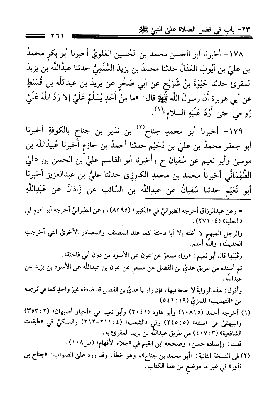 178 - أَخْبَرَنَا أَبُو الْحَسَنِ مُحَمَّدُ بْنُ الْحُسَيْنِ الْعَلَوِيُّ، أَخْبَرَنَا أَبُو بَكْرٍ مُحَمَّدُ بْنُ عَلِيِّ بْنِ أَيُّوبَ الْعَدْلُ، حَدَّثَنَا مُحَمَّدُ بْنُ يَزِيدَ السُّلَمِيُّ، حَدَّثَنَا عَبْدُ اللَّهِ بْنُ يَزِيدَ الْمُقْرِئُ، حَدَّثَنَا حَيْوَةُ بْنُ شُرَيْحٍ، عَنْ أَبِي صَخْرٍ، عَنْ يَزِيدَ بْنِ عَبْدِ اللَّهِ بْنِ قُسَيْطٍ، عَنْ أَبِي هُرَيْرَةَ، أَنَّ رَسُولَ اللَّهِ صَلَّى اللهُ عَلَيْهِ وَسَلَّمَ قَالَ: §«مَا مِنْ أَحَدٍ يُسَلِّمْ عَلَيَّ إِلَّا رَدَّ اللَّهُ عَلَيَّ رُوحِي حَتَّى أَرُدَّ عَلَيْهِ السَّلَامَ»