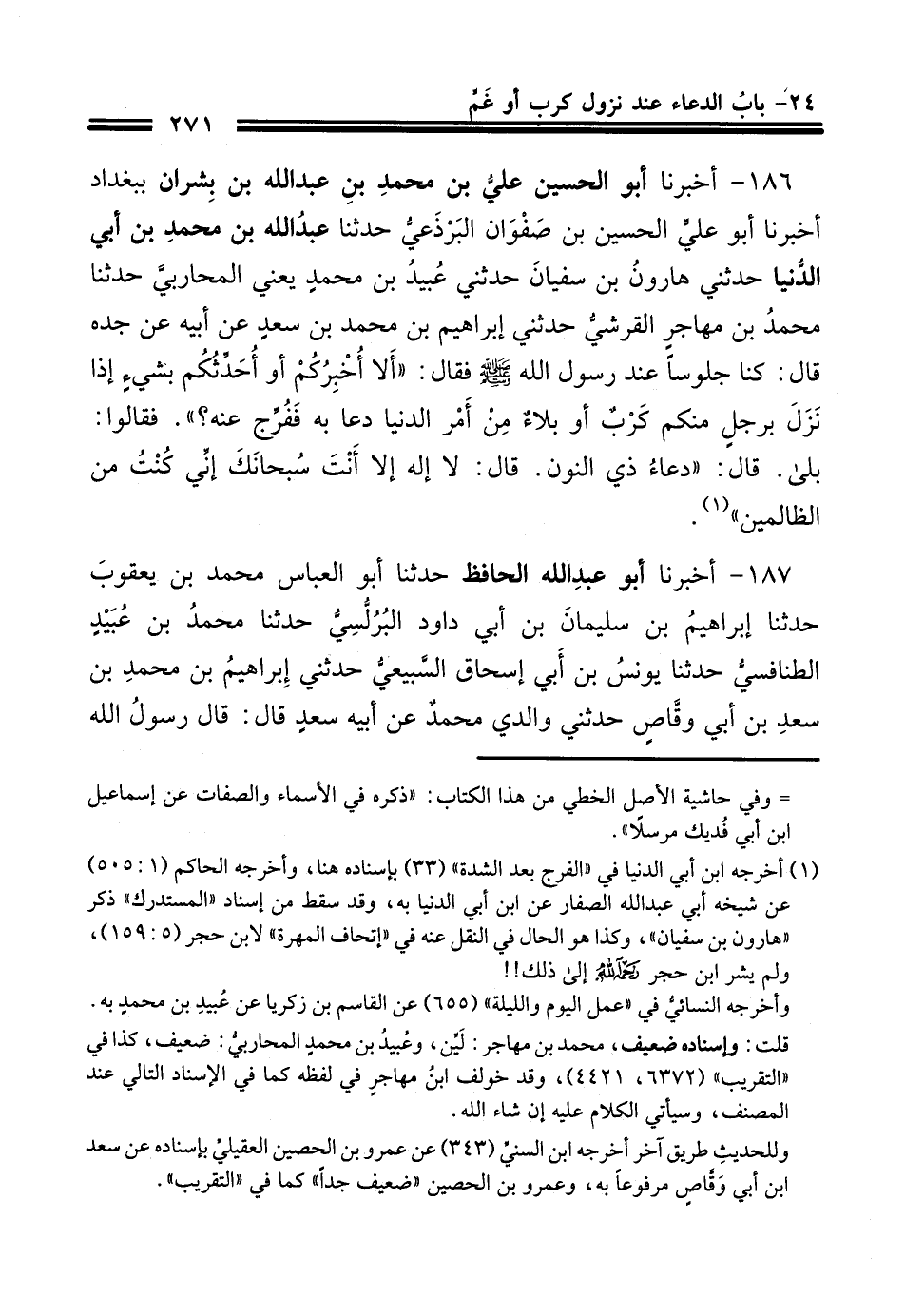 186 - أَخْبَرَنَا أَبُو الْحُسَيْنِ عَلِيُّ بْنُ مُحَمَّدِ بْنِ عَبْدِ اللَّهِ بْنِ بِشْرَانَ بِبَغْدَادَ، أَخْبَرَنَا أَبُو عَلِيٍّ الْحُسَيْنُ بْنُ صَفْوَانَ الْبَرْذَعِيُّ، حَدَّثَنَا عَبْدُ اللَّهِ بْنُ مُحَمَّدِ بْنِ أَبِي الدُّنْيَا، حَدَّثَنِي هَارُونُ بْنُ سُفْيَانَ، حَدَّثَنِي عُبَيْدُ بْنُ مُحَمَّدِ يَعْنِي الْمُحَارِبِيَّ، حَدَّثَنَا مُحَمَّدُ بْنُ مُهَاجِرٍ الْقُرَشِيُّ، حَدَّثَنِي إِبْرَاهِيمُ بْنُ مُحَمَّدِ بْنِ سَعْدٍ، عَنْ أَبِيهِ، عَنْ جَدِّهِ، قَالَ: كُنَّا جُلُوسًا عِنْدَ رَسُولِ اللَّهِ صَلَّى اللهُ عَلَيْهِ وَسَلَّمَ فَقَالَ: §«أَلَا أُخْبِرُكُمْ أَوْ أُحَدِّثُكُمْ بِشَيْءٍ إِذَا نَزَلَ بِرَجُلٍ مِنْكُمْ كَرْبٌ أَوْ بَلَاءٌ مِنْ أَمْرِ الدُّنْيَا دَعَا بِهِ فَفَرَّجَ عَنْهُ؟» قَالُوا: بَلَى، قَالَ: " دُعَاءُ ذِي النُّونِ، قَالَ: لَا إِلَهَ إِلَّا أَنْتَ سُبْحَانَكَ، إِنِّي كُنْتُ مِنَ الظَّالِمِينَ "
