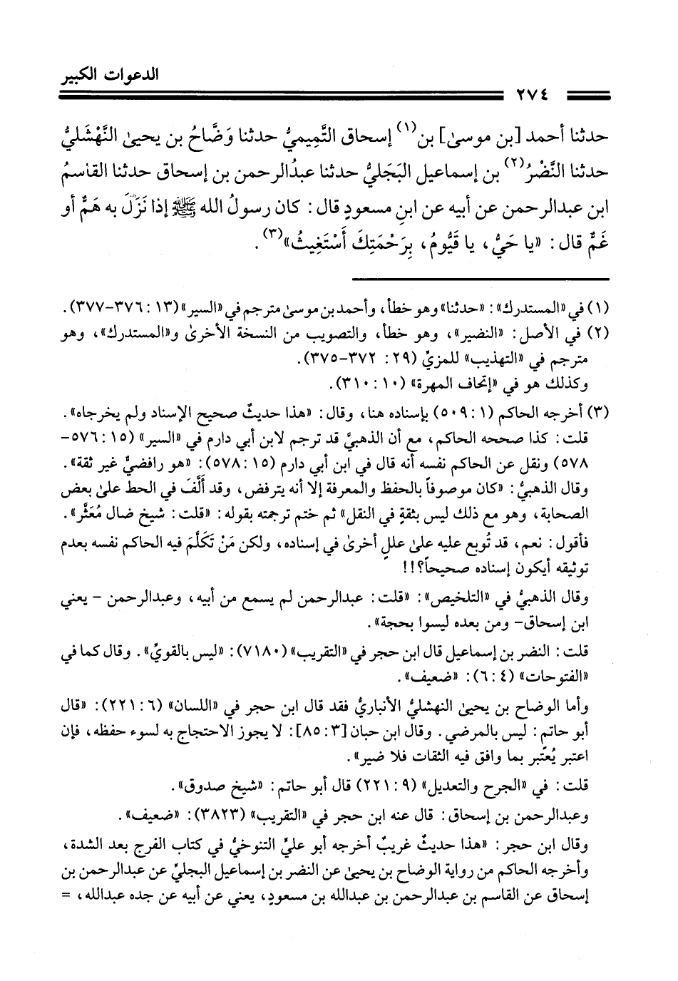 190 - أَخْبَرَنَا أَبُو عَبْدِ اللَّهِ الْحَافِظُ، أَخْبَرَنَا أَبُو بَكْرِ بْنُ أَبِي دَارِمٍ الْحَافِظُ، بِالْكُوفَةِ، حَدَّثَنَا أَحْمَدُ بْنُ مُوسَى بْنِ إِسْحَاقَ التَّمِيمِيُّ، حَدَّثَنَا وَضَّاحُ بْنُ يَحْيَى النَّهْشَلِيُّ، حَدَّثَنَا النَّضْرُ بْنُ إِسْمَاعِيلَ الْبَجَلِيُّ، حَدَّثَنَا عَبْدُ الرَّحْمَنِ بْنُ إِسْحَاقَ، حَدَّثَنَا الْقَاسِمُ بْنُ عَبْدِ الرَّحْمَنِ، عَنْ أَبِيهِ، عَنِ ابْنِ مَسْعُودٍ، قَالَ: «كَانَ رَسُولُ اللَّهِ صَلَّى اللهُ عَلَيْهِ وَسَلَّمَ» §إِذَا نَزَلَ بِهِ هَمٌّ أَوْ غَمٌّ قَالَ: يَا حَيُّ يَا قَيُّومُ، بِرَحْمَتِكَ أَسْتَغِيثُ "