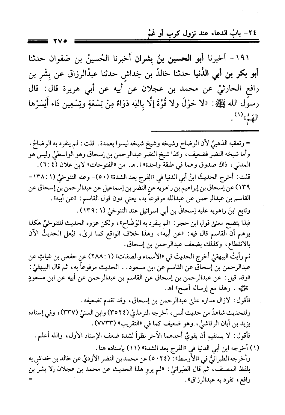 191 - أَخْبَرَنَا أَبُو الْحُسَيْنِ بْنُ بِشْرَانَ، أَخْبَرَنَا الْحُسَيْنُ بْنُ صَفْوَانَ، حَدَّثَنَا أَبُو بَكْرِ بْنُ أَبِي الدُّنْيَا، حَدَّثَنَا خَالِدُ بْنُ خِدَاشٍ، حَدَّثَنَا عَبْدُ الرَّازَّقِ، عَنْ بِشْرِ بْنِ رَافِعٍ الْحَارِثِيُّ، عَنْ مُحَمَّدِ بْنِ عَجْلَانَ , عَنْ أَبِيهِ، عَنْ أَبِي هُرَيْرَةَ، قَالَ: قَالَ رَسُولُ اللَّهِ صَلَّى اللهُ عَلَيْهِ وَسَلَّمَ: «§لَا حَوْلَ وَلَا قُوَّةَ إِلَّا بِاللَّهِ، دَوَاءٌ مِنْ تِسْعَةٍ وَتِسْعِينَ دَاءً، أَيْسَرُهَا الْهَمُّ»
