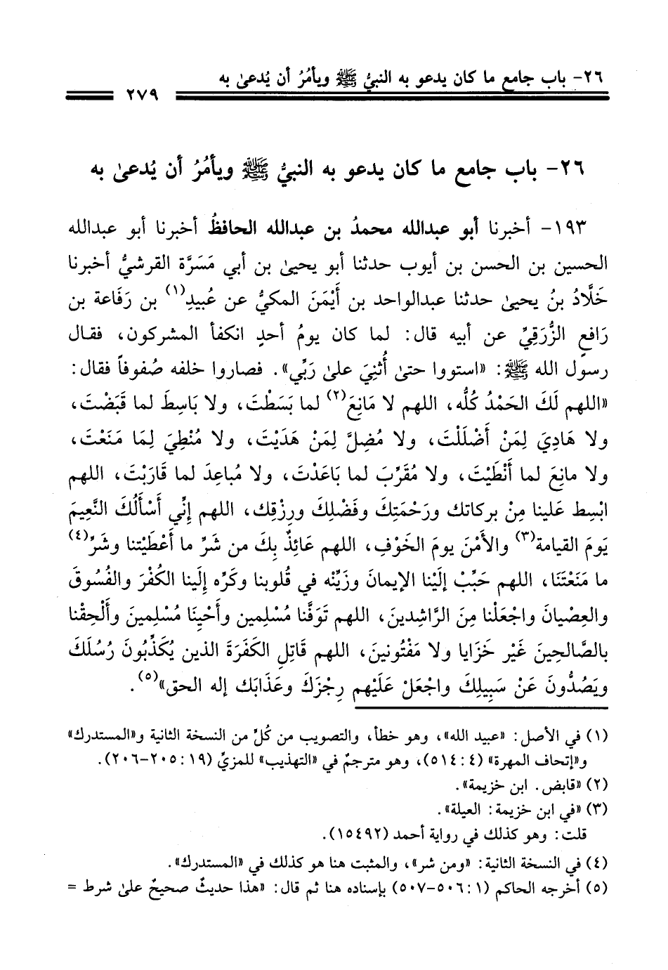 193 - أَخْبَرَنَا أَبُو عَبْدِ اللَّهِ مُحَمَّدُ بْنُ عَبْدِ اللَّهِ الْحَافِظُ، أَخْبَرَنَا أَبُو عَبْدِ اللَّهِ الْحُسَيْنُ بْنُ الْحَسَنِ بْنِ أَيُّوبَ، حَدَّثَنَا أَبُو يَحْيَى بْنُ أَبِي مَسَرَّةَ القُرَشِيُّ، أَخْبَرَنَا خَلَّادُ بْنُ يَحْيَى، حَدَّثَنَا عَبْدُ الْوَاحِدِ بْنُ أَيْمَنَ الْمَكِّيُّ، عَنْ عُبَيْدِ بْنِ رَافِعِ بْنِ رِفَاعَةَ الزُّرَقِيِّ، عَنْ أَبِيهِ، قَالَ: لَمَّا كَانَ يَوْمُ أُحُدٍ انْكَفَأَ الْمُشْرِكُونَ، فَقَالَ رَسُولُ اللَّهِ صَلَّى اللهُ عَلَيْهِ وَسَلَّمَ: «§اسْتَوُوا حَتَّى أُثْنِي عَلَى رَبِّي» فَصَارُو خَلْفَهُ صُفُوفًا، فَقَالَ: «اللَّهُمَّ لَكَ الْحَمْدُ كُلُّهُ، اللَّهُمَّ لَا مَانِعَ لِمَا بَسَطْتَ، وَلَا بَاسِطَ لِمَا قَبَضْتَ، وَلَا هَادِيَ لِمَنْ أَضْلَلْتَ، وَلَا مُضِلَّ لِمَنْ هَدَيْتَ، وَلَا مُنْطِيَ لِمَا مَنَعْتَ، وَلَا مَانِعَ لِمَا أَنْطَيْتَ، وَلَا مُقَرَّبَ لِمَا بَاعَدْتَ، وَلَا مُبَاعِدَ لِمَا قَارَبْتَ، اللَّهُمَّ ابْسُطْ عَلَيْنَا مِنْ بَرَكَاتِكَ، وَرَحْمَتِكَ، وَفَضْلِكَ، وَرِزْقَكَ، اللَّهُمَّ إِنِّي أَسْأَلُكَ النَّعِيمَ يَوْمَ الْقِيَامَةِ، وَالْأَمْنَ يَوْمَ الْخَوْفِ، اللَّهُمَّ عَائِذٌ بِكَ مِنْ شَرِّ مَا أَعْطَيْتَنَا، وَمِنْ شَرِّ مَا مَنَعْتَنَا، اللَّهُمَّ حَبِّبْ إِلَيْنَا الْإِيمَانَ، وَزَيِّنْهُ فِي قُلُوبَنَا، وَكَرِّهْ إِلَيْنَا الْكُفْرَ، وَالْفُسُوقَ، وَالْعِصْيَانَ، وَاجْعَلْنَا مِنَ الرَّاشِدِينَ، اللَّهُمَّ تَوَفَّنَا مُسْلِمَيْنَ، وَأَحْيِنَا مُسْلِمَيْنَ، وَأَلْحِقْنَا بِالصَّالِحِينَ، غَيْرَ خَزَايَا وَلَا مَفْتُونِينَ، اللَّهُمَّ قَاتِلِ الْكَفَرَةَ الَّذِينَ يُكَذِبُونَ رُسُلَكَ، وَيَصُدُّونَ عَنْ سَبِيلِكِ، وَاجْعَلْ عَلَيْهِمْ رِجْزَكَ وَعَذَابَكَ إِلَهَ الْحَقِّ»