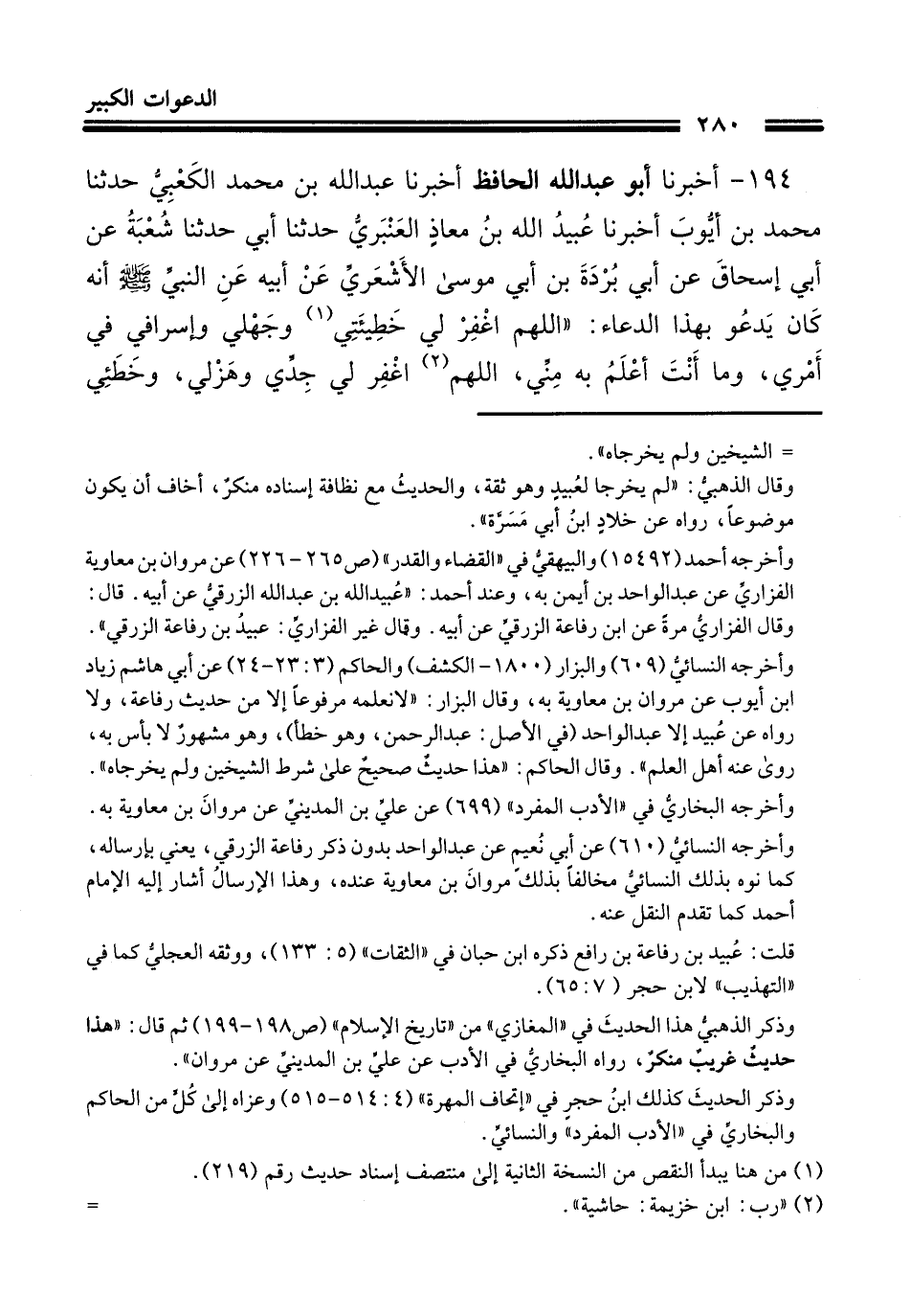 194 - أَخْبَرَنَا أَبُو عَبْدِ اللَّهِ الْحَافِظُ، أَخْبَرَنَا عَبْدُ اللَّهِ بْنُ مُحَمَّدٍ الْكَعْبِيُّ، حَدَّثَنَا مُحَمَّدُ بْنُ أَيُّوبَ، أَخْبَرَنَا عُبَيْدُ اللَّهِ بْنُ مُعَاذٍ الْعَنْبَرِيُّ، حَدَّثَنَا أَبِي، حَدَّثَنَا شُعْبَةُ، عَنْ أَبِي إِسْحَاقَ، عَنْ أَبِي بُرْدَةَ بْنِ أَبِي مُوسَى الْأَشْعَرِيِّ، عَنْ أَبِيهِ، عَنِ النَّبِيِّ صَلَّى اللهُ عَلَيْهِ وَسَلَّمَ أَنَّهُ كَانَ يَدْعُو بِهَذَا الدُّعَاءِ: «§اللَّهُمَّ اغْفِرْ لِي خَطِيئَتِي، وَجَهْلِي، وَإِسْرَافِي فِي أَمْرِي، وَمَا أَنْتَ أَعْلَمُ بِهِ مِنِّي، اللَّهُمَّ اغْفِرْ لِي جَدِّي، وَهَزْلِي، وَخَطَئِي، وَعَمْدِي، وَكُلَّ ذَلِكَ عِنْدِي، اللَّهُمَّ اغْفِرْ لِي مَا قَدَّمْتُ وَمَا أَخَّرْتُ، وَمَا أَسْرَرْتُ وَمَا أَعْلَنْتُ، وَمَا أَنْتَ أَعْلَمُ بِهِ مِنِّي، أَنْتَ الْمُقَدِّمُ وَأَنْتَ الْمُؤَخِّرُ، وَأَنْتَ عَلَى كُلِّ شَيْءٍ قَدِيرٌ»