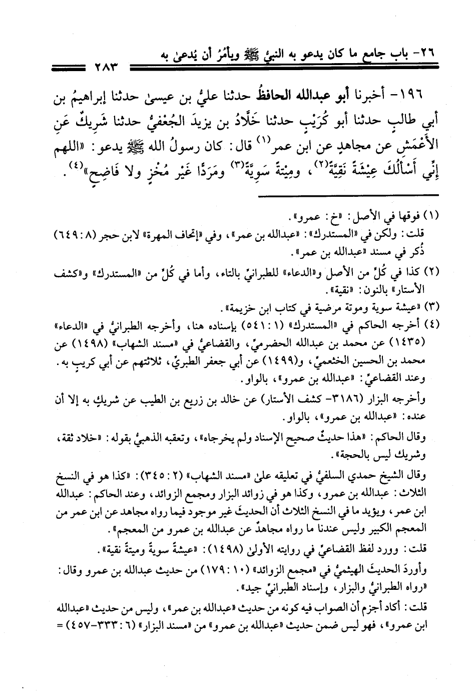 196 - أَخْبَرنا أبو عبد الله الحافظ حَدَّثَنا علي بن عيسى حدثنا إبراهيم بن أبي طالب، حدثنا أبو كريب، حدثنا خلاد بن يزيد الجعفي، حدثنا شريك، عن الأعمش، عن مجاهد، عن ابن عمر رضي الله عنهما، قال: كان رسول الله صَلَّى اللهُ عَلَيْهِ وَسَلَّمَ يدعو: اللهم إني أسألك عيشة نقية، وميتة سوية، ومردا غير مخز، ولا فاضح.