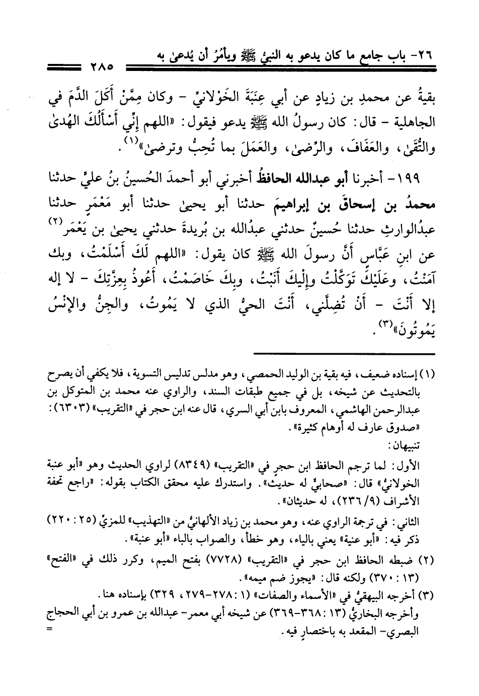 199 - أَخْبَرنَا أبو عبد الله الحافظ أَخْبَرَنِي أبو أحمد الحُسَين بن علي حَدَّثَنا محمد بن إسحاق بن إبراهيم حَدَّثَنا أبو يحيى حَدَّثَنا أبو معمر حَدَّثَنا عبد الوارث حَدَّثَنا حسين حَدَّثَنِي عبد الله بن بريدة حَدَّثَنِي يحيى بن يعمر عن ابن عباس رضي الله عنهما أن رسول الله صَلَّى اللهُ عَلَيْهِ وَسَلَّمَ كان يقول اللهم لك أسلمت، وبك آمنت، وعليك توكلت، وإليك أنبت، وبك خاصمت، أعوذ بعزتك، لا إله إلا أنت، أن تضلني، أنت الحي الذي لا يموت، والجن والإنس يموتون.