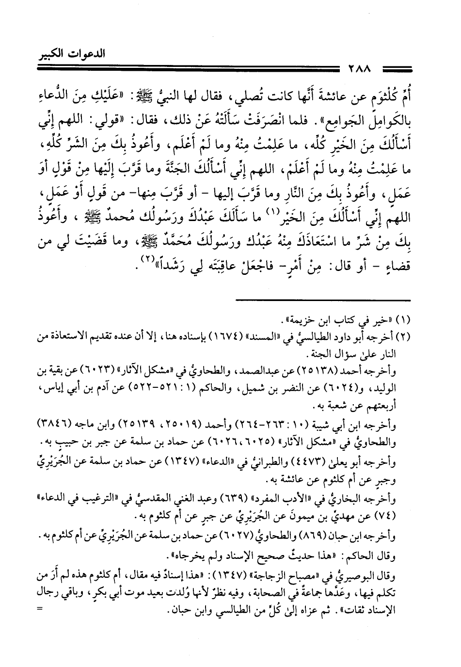 202 - حَدَّثَنا أبو بَكْر محمد بن الحَسَن أَخْبَرنَا عبد الله بن جعفر حَدَّثَنا يونس بن حبيب حَدَّثَنا أبو داود حدثنا شُعْبة عن جبر بن حبيب عن أم كلثوم عن عائشة رضي الله عنها أنها كانت تصلي، فقال لها النبي صَلَّى اللهُ عَلَيْهِ وَسَلَّمَ: عليك من الدعاء بالكوامل الجوامع، فلما انصرفت سألته عن ذلك؟ فقال لها: قولي: اللهم إني أسألك من الخير كله ما علمت منه، وما لم أعلم، وأعوذ بك من الشر كله ما علمت منه، وما لم أعلم، اللهم إني أسألك الجنة وما قرب إليها من قول، أو عمل، وأعوذ بك من النار وما قرب إليها او قرب منها من قول، أو عمل، اللهم إني أسألك من الخير ما سألك عبدك ورسولك محمد صَلَّى اللهُ عَلَيْهِ وَسَلَّمَ وأعوذ بك من شر ما استعاذك منه عبدك ورسولك محمد صَلَّى اللهُ عَلَيْهِ وَسَلَّمَ وأسألك وما قضيت لي من فاجعل عاقبته لي رشدا.