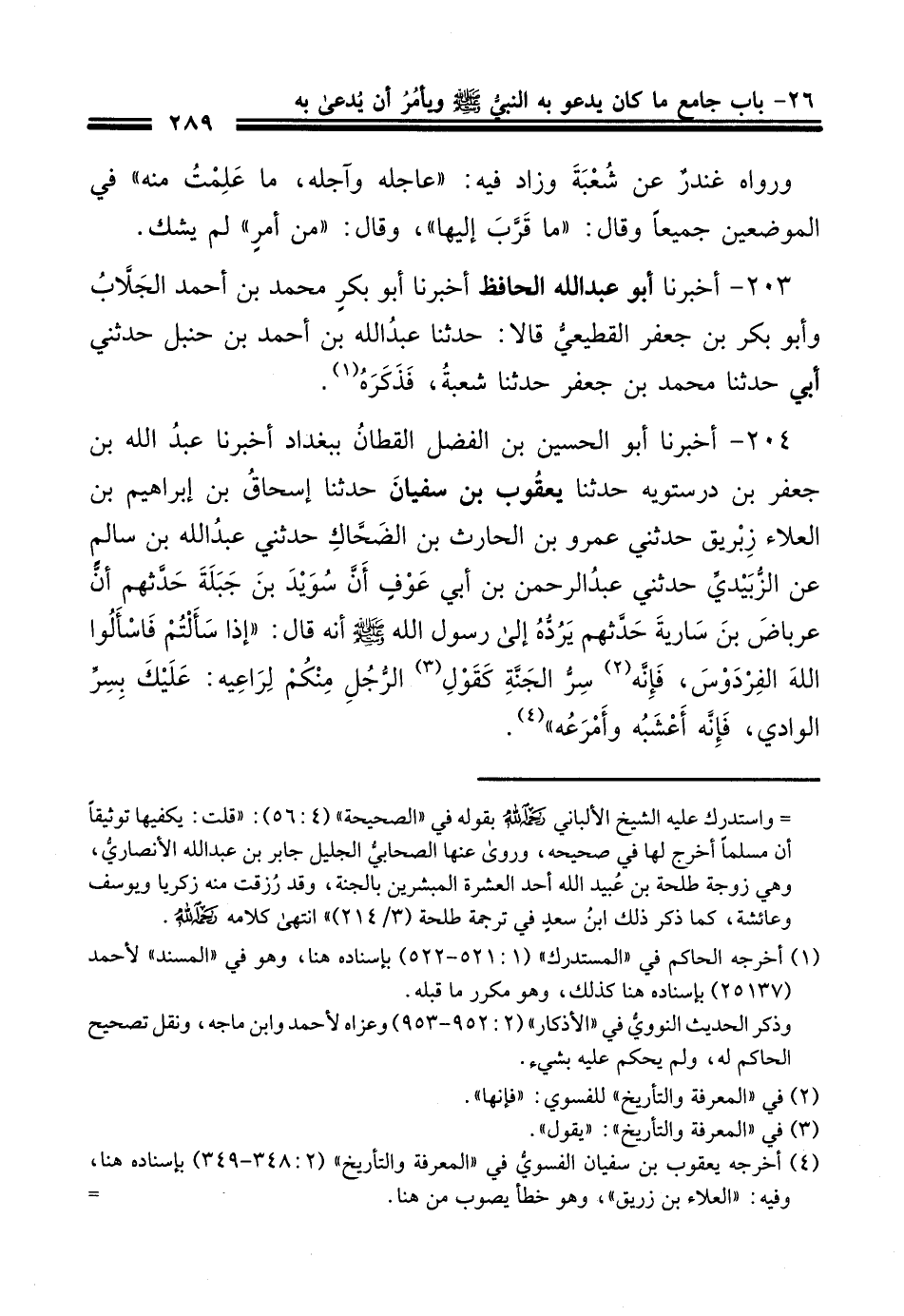 204 - أَخْبَرنا أبو الحُسَين بن بن الفضل القطان ببغداد أَخْبَرنَا عبد الله بن جعفر بن درستويه حَدَّثَنا يعقوب بن سفيان حَدَّثَنا إسحاق بن إبراهيم بن العلاء زبريق حَدَّثَنِي عمرو بن الحارث بن الضحاك حَدَّثَنِي عبد الله بن سالم عن الزبيدي حَدَّثَنِي عبد الرحمن بن أبي عوف أن سويد بن جبلة حدثهم أن عرباض بن سارية رضي الله عنه حدثهم يرده إلى رسول الله صَلَّى اللهُ عَلَيْهِ وَسَلَّمَ أنه قال إذا سألتم فاسألوا الله الفردوس فإنه سر الجنة كقول الرجل منكم لراعيه عليك بسر الوادي فإنه أعشبه وأمرعه.