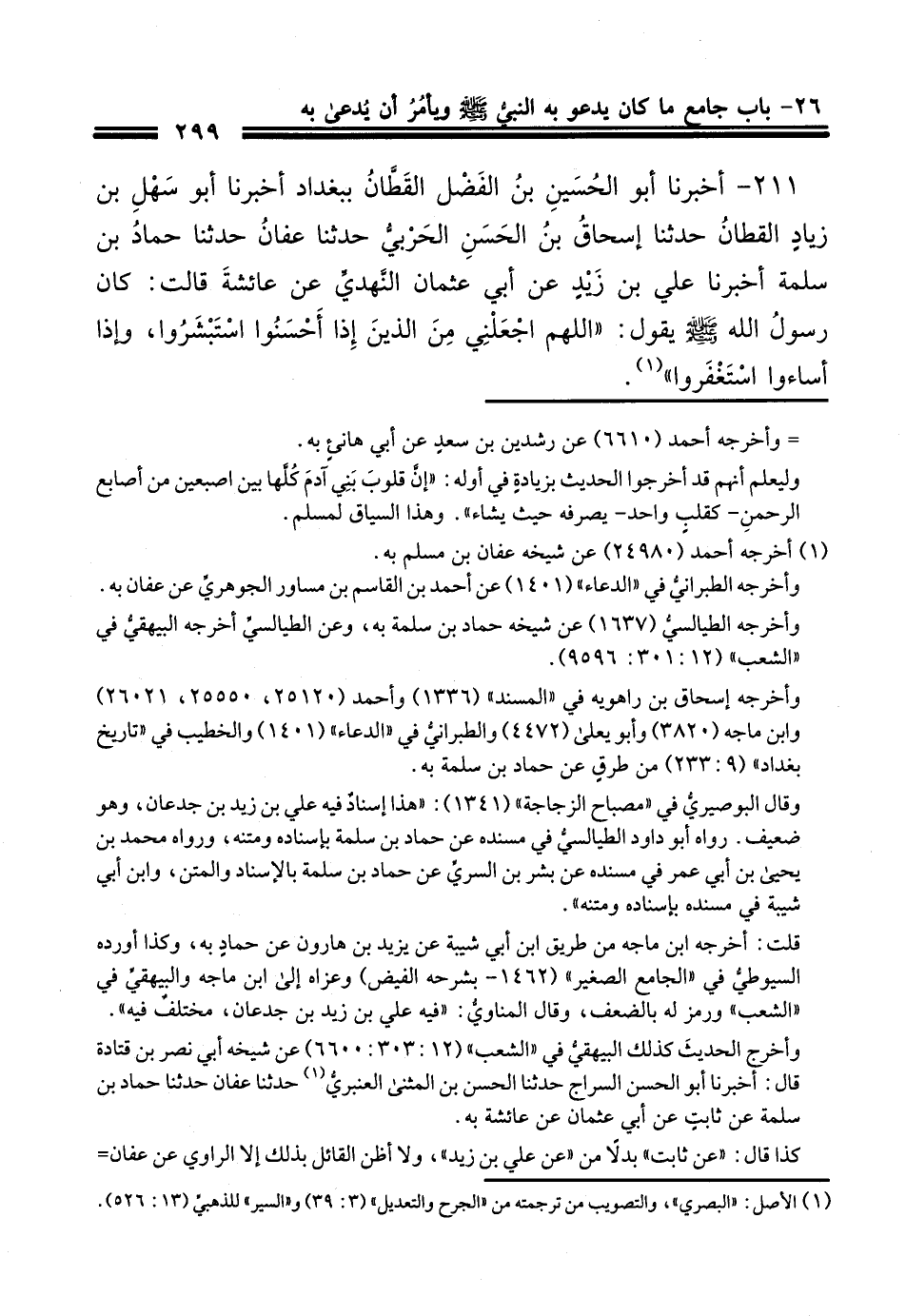 211 - أَخْبَرنا أبو الحُسَين بن الفضل القطان ببغداد أَخْبَرنَا أبو سهل بن زياد القطان حَدَّثَنا إسحاق بن الحَسَن الحربي حَدَّثَنا عفان حَدَّثَنا حمَّاد بن سَلَمة أَخْبَرنَا علي بن زيد عن أبي عثمان النهدي عن عائشة رضي الله عنها قالت كان رسول الله صَلَّى اللهُ عَلَيْهِ وَسَلَّمَ يقول اللهم اجعلني من الذين إذا أحسنوا استبشروا , وإذا أساءوا استغفروا.