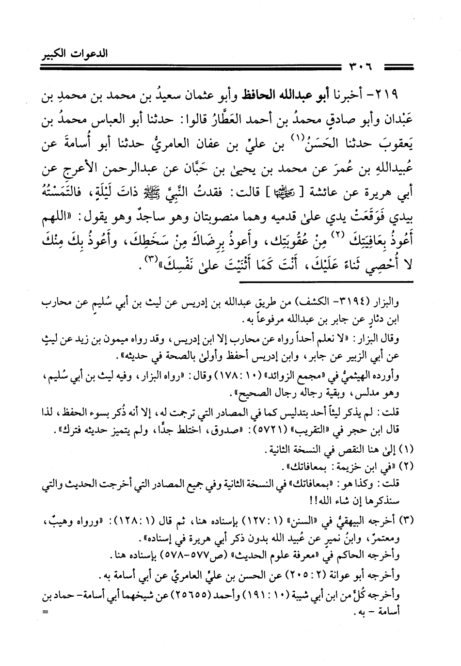 219 - أَخْبَرنا أبو عبد الله الحافظ وأبو عثمان سعيد بن محمد بن محمد بن عبدان وأبو صادق محمد بن أحمد العطار قالوا حَدَّثَنا أبو العباس محمد بن يعقوب حَدَّثَنا الحَسَن بن علي بن عفان العامري حَدَّثَنَا أَبُو أُسَامَةَ، عَنْ عُبَيْدِ اللهِ بْنِ عُمَرَ، عَنْ مُحَمَّدِ بْنِ يَحْيَى بْنِ حِبَّانَ، عَنْ عَبْدِ الرَّحْمَنِ الأَعْرَجِ، عَنْ أَبِي هُرَيْرَةَ، عَنْ عائشة رضي الله عنها، قَالَتْ: فَقَدْتُ رَسُولَ اللهِ صَلَّى اللهُ عَلَيْهِ وَسَلَّمَ ذَاتَ لَيْلَةٍ فَالتَّمَسْتُهُ بِيَدِي فَوَقَعَتْ يَدِي عَلَى قَدَمَيْهِ وَهُمَا مَنْصُوبَتَانِ وَهُوَ سَاجِدٌ وَهُوَ يَقُولُ: «§اللَّهُمَّ أَعُوذُ بِمُعَافَاتِكَ مِنْ عُقُوبَتِكَ، وَأَعُوذُ بِرِضَاكَ مِنْ سَخَطِكَ، وَأَعُوذُ بِكَ مِنْكَ، لَا أُحْصِي ثَنَاءً عَلَيْكَ، وَأَنْتَ كَمَا أَثْنَيْتَ عَلَى نَفْسِكَ»