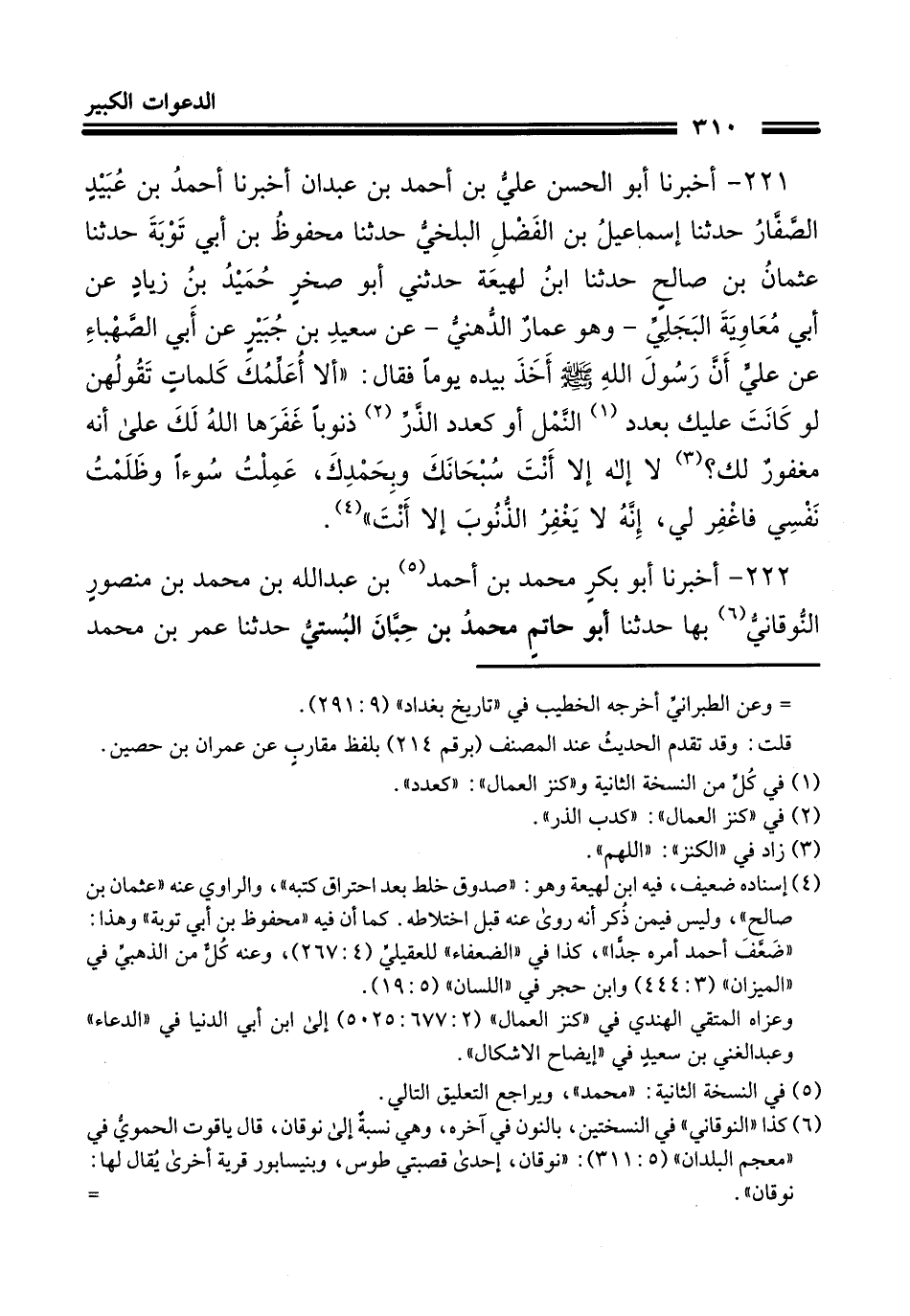 221 - أَخْبَرَنَا أَبُو الْحَسَنِ عَلِيُّ بْنُ أَحْمَدَ بْنِ عَبْدَانَ، أَخْبَرَنَا أَحْمَدُ بْنُ عُبَيْدٍ الصَّفَّارُ، حَدَّثَنَا إِسْمَاعِيلُ بْنُ الْفَضْلِ الْبَلْخِيُّ، حَدَّثَنَا مَحْفُوظُ بْنُ أَبِي تَوْبَةَ، حَدَّثَنَا عُثْمَانُ بْنُ صَالِحٍ، حَدَّثَنَا ابْنُ لَهِيعَةَ، حَدَّثَنِي أَبُو صَخْرٍ حُمَيْدُ بْنُ زِيَادٍ، عَنْ أَبِي مُعَاوِيَةَ الْبَجَلِيِّ وَهُوَ عَمَّارُ الدُّهْنِيُّ، عَنْ سَعِيدِ بْنِ جُبَيْرٍ، عَنْ أَبِي الصَّهْبَاءِ، عَنْ عَلِيٍّ، أَنَّ رَسُولَ اللَّهِ صَلَّى اللهُ عَلَيْهِ وَسَلَّمَ أَخَذَ بِيَدِهِ يَوْمًا فَقَالَ: §«أَلَا أُعَلِّمُكَ كَلِمَاتٍ تَقُولُهُنَّ لَوْ كَانَتْ عَلَيْكَ كَعَدَدِ النَّمْلِ أَوْ كَعَدَدِ الذَّرِّ ذَنُوبًا غَفَرَهَا اللَّهُ لَكَ، عَلَى أَنَّهُ مَغْفُورٌ لَكَ؟ لَا إِلَهَ إِلَّا أَنْتَ سُبْحَانَكَ وَبِحَمْدِكَ، عَمِلْتُ سُوءًا وَظَلَمْتُ نَفْسِي، فَاغْفِرْ لِي، إِنَّهُ لَا يَغْفِرُ الذُّنُوبَ إِلَّا أَنْتَ»