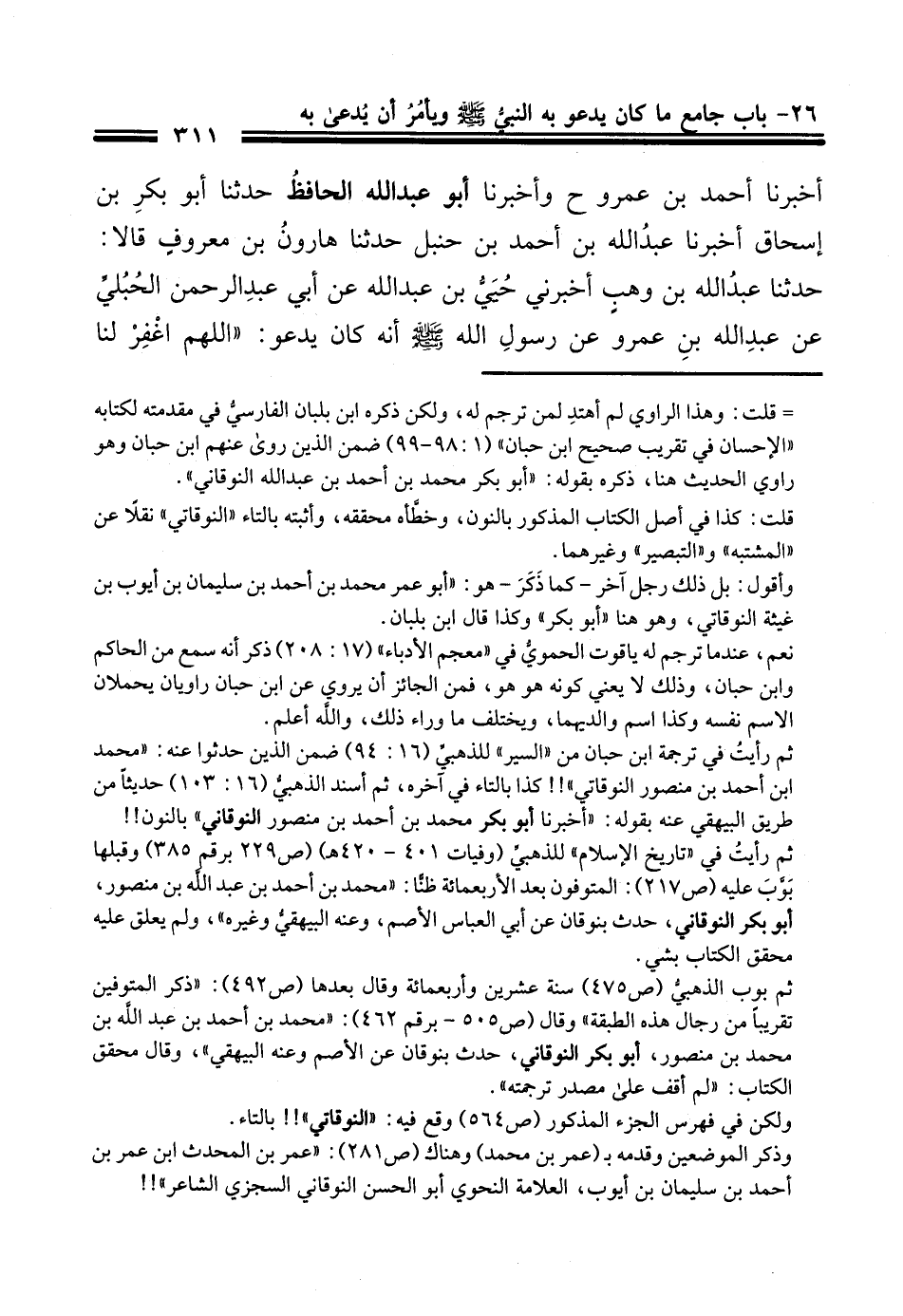 222 - أَخْبَرَنَا أَبُو بَكْرٍ مُحَمَّدُ بْنُ مُحَمَّدِ بْنِ عَبْدِ اللَّهِ بْنِ مُحَمَّدِ بْنِ مَنْصُورٍ النُّوقَانِيُّ بِهَا، حَدَّثَنَا أَبُو حَاتِمٍ مُحَمَّدُ بْنُ حَبَّانَ الْبِسْتِيُّ، أَخْبَرَنَا عُمَرُ بْنُ مُحَمَّدٍ، أَخْبَرَنَا أَحْمَدُ بْنُ عَمْرٍو، وَأَخْبَرَنَا أَبُو عَبْدِ اللَّهِ الْحَافِظِ، حَدَّثَنَا أَبُو بَكْرِ بْنُ إِسْحَاقَ، أَخْبَرَنَا عَبْدُ اللَّهِ بْنُ أَحْمَدَ بْنِ حَنْبَلٍ، حَدَّثَنَا هَارُونُ بْنُ مَعْرُوفٍ، قَالَا: حَدَّثَنَا عَبْدُ اللَّهِ بْنُ وَهْبٍ، أَخْبَرَنِي حُيَيُّ بْنُ عَبْدِ اللَّهِ، عَنْ أَبِي عَبْدِ الرَّحْمَنِ الْحُبُلِيِّ، عَنْ عَبْدِ اللَّهِ بْنِ عَمْرٍو، عَنْ رَسُولِ اللَّهِ صَلَّى اللهُ عَلَيْهِ وَسَلَّمَ أَنَّهُ كَانَ يقول: «§اللَّهُمَّ اغْفِرْ لَنَا ذُنُوبَنَا، وَظُلْمَنَا، وَهَزْلَنَا، وَجَدَّنَا، وَعَمْدَنَا، وَكُلَّ ذَلِكَ عِنْدَنَا» زَادَ أَحْمَدُ بْنُ عَمْرٍو فِي حَدِيثِهِ: «اللَّهُمَّ إِنِّي أَعُوذُ بِكَ مِنْ غَلَبَةِ الدَّيْنِ، وَغَلَبَةَ الْعِبَادِ، وَشَمَاتَةِ الْأَعْدَاءِ»