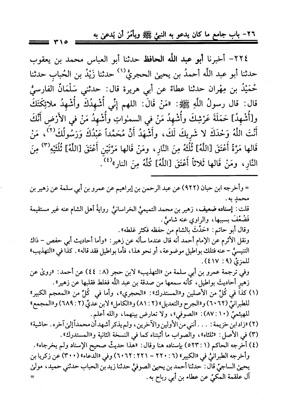 224 - أَخْبَرَنَا أَبُو عَبْدِ اللَّهِ الْحَافِظُ، حَدَّثَنَا أَبُو الْعَبَّاسِ مُحَمَّدُ بْنُ يَعْقُوبَ، حَدَّثَنَا أَبُو عَبْدِ اللَّهِ أَحْمَدُ بْنُ يَحْيَى الصُّوفِيُّ، حَدَّثَنَا زَيْدُ بْنُ الْحُبَابِ، حَدَّثَنَا حُمَيْدُ بْنُ مِهْرَانَ، حَدَّثَنَا عَطَاءٌ، عَنْ أَبِي هُرَيْرَةَ، قَالَ: حَدَّثَنِي سَلْمَانُ الْفَارِسِيُّ، قَالَ: قَالَ رَسُولُ اللَّهِ صَلَّى اللهُ عَلَيْهِ وَسَلَّمَ: " §مَنْ قَالَ: اللَّهُمَّ إِنِّي أُشْهِدُكَ، وَأُشْهِدُ مَلَائِكَتَكَ، وَأُشْهِدُ حَمَلَةَ عَرْشِكَ، وَأُشْهِدُ مَنْ فِي السَّمَوَاتِ، وَأُشْهِدُ مَنْ فِي الْأَرْضِ، أَنَّكَ أَنْتَ اللَّهُ، وَحْدَكَ لَا شَرِيكَ لَكَ، وَأَشْهَدُ أَنَّ مُحَمَّدًا عَبْدُكَ وَرَسُولُكَ، مَنْ قَالَهَا مَرَّةً أَعْتَقَ اللَّهُ ثُلُثَهُ مِنَ النَّارِ، وَمَنْ قَالَهَا مَرَّتَيْنِ أَعْتَقَ اللَّهُ ثُلُثَيْهِ مِنَ النَّارِ، وَمَنْ قَالَهَا ثَلَاثًا أَعْتَقَ اللَّهُ كُلَّهُ مِنَ النَّارِ "