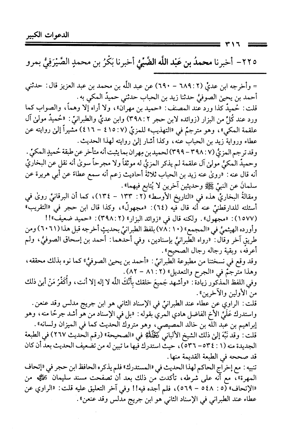 225 - أَخْبَرَنَا مُحَمَّدُ بْنُ عَبْدِ اللَّهِ الضَّبِّيُّ، أَخْبَرَنَا بَكْرُ بْنُ مُحَمَّدٍ الصَّيْرَفِيُّ، بِمَرْوَ، حَدَّثَنَا عَبْدُ الصَّمَدِ بْنُ الْفَضْلِ، حَدَّثَنَا عَبْدُ اللَّهِ بْنُ يَزِيدَ الْمُقْرِئُ، حَدَّثَنَا سَعِيدُ بْنُ أَبِي أَيُّوبَ، حَدَّثَنِي عَبْدُ اللَّهِ بْنُ الْوَلِيدِ، عَنْ عَبْدِ اللَّهِ بْنِ عَبْدِ الرَّحْمَنِ بْنِ حُجَيْرَةَ، عَنْ أَبِيهِ، عَنْ أَبِي هُرَيْرَةَ، أَنَّ رَسُولَ اللَّهِ صَلَّى اللهُ عَلَيْهِ وَسَلَّمَ أَوْصَى سَلْمَانَ الْخَيْرَ فَقَالَ: يَا سَلْمَانُ، إِنَّ رَسُولَ اللَّهِ صَلَّى اللهُ عَلَيْهِ وَسَلَّمَ يُرِيدُ أَنْ يَمْنَحَكَ كَلِمَاتٍ تَسْأَلُهُنَّ الرَّحْمَنَ، وَتَرْغَبُ إِلَيْهِ فِيهِنَّ، وَتَدْعُو بِهِنَّ فِي اللَّيْلِ وَالنَّهَارِ، قُلِ: «§اللَّهُمَّ إِنِّي أَسْأَلُكَ صِحَّةً فِي إِيمَانٍ، وَإِيمَانًا فِي حُسْنِ خُلُقٍ، وَنَجَاحًا يَتْبَعُهُ فَلَاحٌ، وَرَحْمَةً مِنْكَ وَعَافِيَةً، وَمَغْفِرَةً مِنْكَ وَرِضْوَانًا»