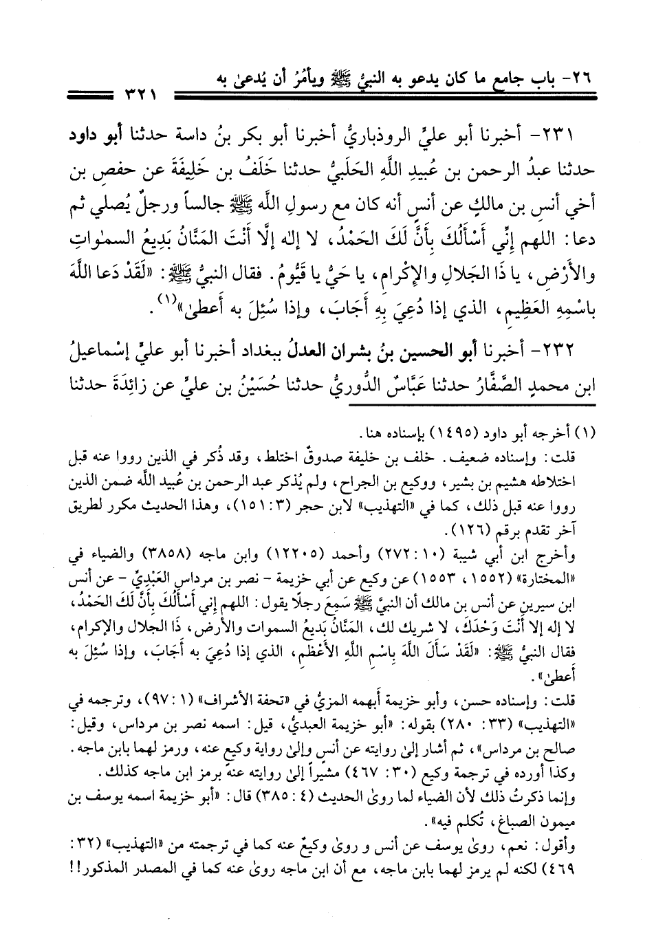 231 - أَخْبَرَنَا أَبُو عَلِيٍّ الرُّوذْبَارِيُّ، أَخْبَرَنَا أَبُو بَكْرِ بْنُ دَاسَةَ، حَدَّثَنَا أَبُو دَاوُدَ، حَدَّثَنَا عَبْدُ الرَّحْمَنِ بْنُ عُبَيْدِ اللَّهِ الْحَلَبِيُّ، حَدَّثَنَا خَلَفُ بْنُ خَلِيفَةَ، عَنْ حَفْصِ ابْنِ أَخِي أَنَسِ بْنِ مَالِكٍ، عَنْ أَنَسٍ، أَنَّهُ كَانَ مَعَ رَسُولِ اللَّهِ صَلَّى اللهُ عَلَيْهِ وَسَلَّمَ جَالِسًا وَرَجُلٌ يُصَلِّي ثُمَّ دَعَا: اللَّهُمَّ إِنِّي أَسْأَلُكَ بِأَنَّ لَكَ الْحَمْدُ، لَا إِلَهَ إِلَّا أَنْتَ الْمَنَّانُ، بَدِيعُ السَّمَوَاتِ وَالْأَرْضِ، يَا ذَا الْجَلَالِ وَالْإِكْرَامِ، يَا حَيُّ يَا قَيُّومُ، فَقَالَ النَّبِيُّ صَلَّى اللهُ عَلَيْهِ وَسَلَّمَ: «لَقَدْ» §دَعَا اللَّهَ بِاسْمِهِ الْعَظِيمِ، الَّذِي إِذَا دُعِيَ بِهِ أَجَابَ، وَإِذَا سُئِلَ بِهِ أَعْطَى "