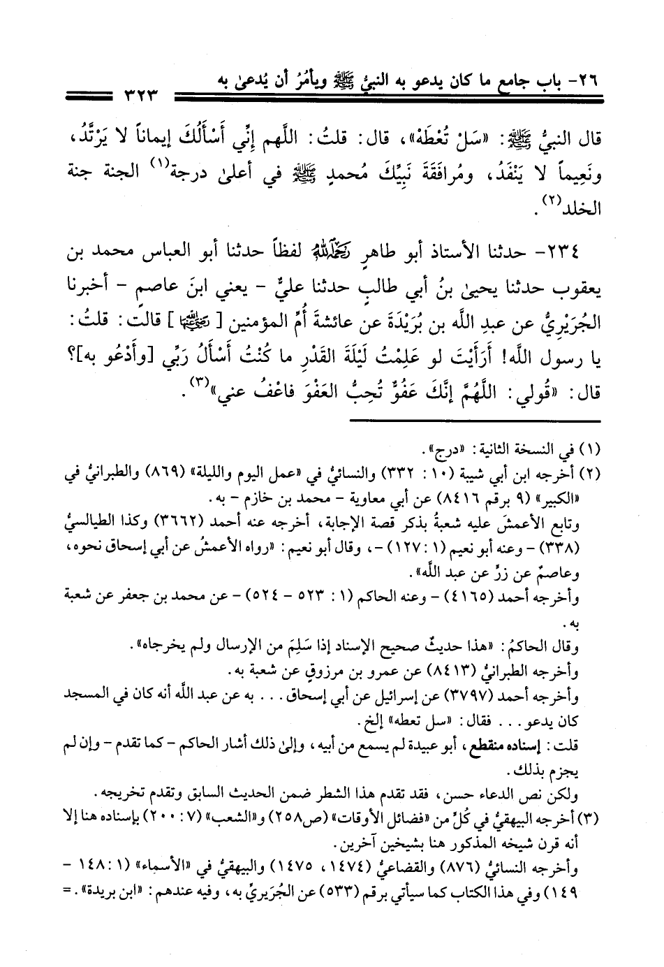 234 - حَدَّثَنَا الْأُسْتَاذُ أَبُو طَاهِرٍ، لَفْظًا، حَدَّثَنَا أَبُو الْعَبَّاسِ مُحَمَّدُ بْنُ يَعْقُوبَ، حَدَّثَنَا يَحْيَى بْنُ أَبِي طَالِبٍ، حَدَّثَنَا عَلِيٌّ يَعْنِي ابْنَ عَاصِمٍ، أَخْبَرَنَا الْجُرَيْرِيُّ، عَنْ عَبْدِ اللَّهِ بْنِ بُرَيْدَةَ، عَنْ عَائِشَةَ أُمِّ الْمُؤْمِنِينَ، رَضِيَ اللَّهُ عَنْهَا قَالَتْ: قُلْتُ: يَا رَسُولَ اللَّهِ، أَرَأَيْتَ لَوْ عَلِمْتُ لَيْلَةَ الْقَدْرِ، مَا كُنْتُ أَسْأَلُ رَبِّي وَأَدْعُو بِهِ؟ قَالَ: " §قُولِي: اللَّهُمَّ إِنَّكَ عَفُوٌّ تُحِبُّ الْعَفْوَ فَاعْفُ عَنِّي "