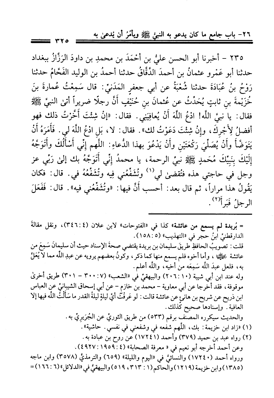 235 - أَخْبَرَنَا أَبُو الْحَسَنِ عَلِيُّ بْنُ أَحْمَدَ بْنِ مُحَمَّدِ بْنِ دَاوُدَ الرَّزَّازُ بِبَغْدَادَ، حَدَّثَنَا أَبُو عَمْرٍو عُثْمَانُ بْنُ أَحْمَدَ الدَّقَّاقُ، حَدَّثَنَا أَحْمَدُ بْنُ الْوَلِيدِ الْفَحَّامُ، حَدَّثَنَا رَوْحُ بْنُ عُبَادَةَ، حَدَّثَنَا شُعْبَةُ، عَنْ أَبِي جَعْفَرٍ الْمَدَنِيِّ، قَالَ: سَمِعْتُ عُمَارَةَ بْنَ خُزَيْمَةَ بْنُ ثَابِتٍ، يُحَدِّثُ عَنْ عُثْمَانَ بْنِ حُنَيْفٍ، أَنَّ رَجُلًا ضَرِيرًا أَتَى النَّبِيَّ صَلَّى اللهُ عَلَيْهِ وَسَلَّمَ، فَقَالَ: يَا نَبِيَّ اللَّهِ، ادْعُ اللَّهَ أَنْ يُعَافِيَنِيَ، فَقَالَ: «§إِنْ شِئْتَ أَخَّرْتُ ذَلِكَ فَهُوَ أَفْضَلُ لِأَجْرِكَ، وَإِنْ شِئْتَ دَعَوْتُ لَكَ» فَقَالَ: لَا، بَلِ ادْعُ اللَّهَ لِي، فَأَمَرَهُ أَنْ يَتَوَضَّأَ وَأَنْ يُصَلِّيَ رَكْعَتَيْنِ، وَأَنْ يَدْعُوَ بِهَذَا الدُّعَاءِ: اللَّهُمَّ إِنِّي أَسْأَلُكَ وَأَتَوَجَّهُ إِلَيْكَ بِنَبِيِّكَ مُحَمَّدٍ صَلَّى اللهُ عَلَيْهِ وَسَلَّمَ نَبِيِّ الرَّحْمَةِ، يَا مُحَمَّدُ، إِنِّي أَتَوَجَّهُ بِكَ إِلَى رَبِّي عَزَّ وَجَلَّ فِي حَاجَتِي هَذِهِ، فَتَقْضِي لِي وَتُشَفِّعُنِي فِيهِ وَتُشَفِّعُهُ فِيَّ، قَالَ: فَكَانَ يَقُولُ هَذَا مِرَارًا ثُمَّ قَالَ بَعْدُ: أَحْسِبُ أَنَّ فِيهَا وَتُشَفِّعُنِي فِيهِ، قَالَ: فَفَعَلَ الرَّجُلَ فَبَرَأَ "