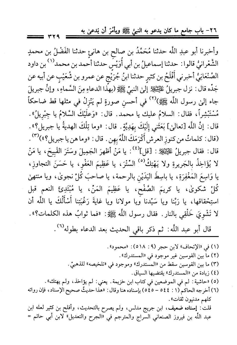238 - أَخْبَرَنَا أَبُو عَبْدِ اللَّهِ الْحَافِظُ، أَخْبَرَنَا أَبُو الْعَبَّاسِ مُحَمَّدُ بْنُ أَحْمَدَ الْمَحْبُوبِيُّ بِمَرْوَ، حَدَّثَنَا مُحَمَّدُ بْنُ عِيسَى الطُّرَسُوسِيُّ، ح وَأَخْبَرَنَا أَبُو عَبْدِ اللَّهِ، حَدَّثَنَا أَحْمَدُ بْنُ سَلْمَانَ الْفَقِيهُ، بِبَغْدَادَ، حَدَّثَنَا إِسْمَاعِيلُ بْنُ إِسْحَاقَ الْقَاضِي ح , وَأَخْبَرَنَا أَبُو عَبْدِ اللَّهِ حَدَّثَنَا مُحَمَّدُ بْنُ صَالِحِ بْنِ هَانِئٍ، حَدَّثَنَا الْفَضْلُ بْنُ مُحَمَّدِ الشَّعْرَانِيُّ، قَالُوا: أَخْبَرَنَا إِسْمَاعِيلُ بْنُ أَبِي أُوَيْسٍ، حَدَّثَنَا أَحْمَدُ بْنُ مُحَمَّدِ بْنِ دَاوُدَ الصَّنْعَانِيُّ، أَخْبَرَنِي أَفْلَحُ بْنُ كَثِيرٍ، حَدَّثَنَا ابْنُ جُرَيْجٍ، عَنْ عَمْرِو بْنِ شُعَيْبٍ، عَنْ أَبِيهِ، عَنْ جَدِّهِ، قَالَ: نَزَلَ جِبْرِيلُ عَلَيْهِ السَّلَامُ إِلَى النَّبِيِّ صَلَّى اللهُ عَلَيْهِ وَسَلَّمَ بِهَذَا الدُّعَاءِ مِنَ السَّمَاءِ، وَإِنَّ جِبْرِيلَ جَاءَ إِلَى رَسُولِ اللَّهِ صَلَّى اللهُ عَلَيْهِ وَسَلَّمَ فِي أَحْسَنِ صُورَةٍ لَمْ يَنْزِلْ فِي مِثْلِهَا قَطُّ ضَاحِكًا مُسْتَبْشِرًا، فَقَالَ: السَّلَامُ عَلَيْكَ يَا مُحَمَّدُ، قَالَ: «وَعَلَيْكَ السَّلَامُ يَا جِبْرِيلُ» قَالَ: إِنَّ اللَّهَ بَعَثَنِي إِلَيْكَ بِهَدِيَّةٍ، قَالَ: «§مَا تِلْكَ الْهَدِيَّةُ يَا جِبْرِيلُ؟» قَالَ: كَلِمَاتٌ مِنْ كُنُوزِ الْعَرْشِ أَكْرَمَكَ اللَّهُ بِهِنَّ، قَالَ: «وَمَا هُنَّ يَا جِبْرِيلُ؟» قَالَ: فَقَالَ جِبْرِيلُ عَلَيْهِ السَّلَامُ: قُلْ: يَا مَنْ أَظْهَرَ الْجَمِيلَ، وَسَتَرَ الْقَبِيحَ، يَا مَنْ لَا يُؤَاخِذُ بِالْجَرِيرَةِ، وَلَا يَهْتِكُ السِّتْرَ , يَا عَظِيمَ الْعَفْوِ , يَا حَسَنَ التَّجَاوُزِ، يَا وَاسِعَ الْمَغْفِرَةِ، يَا بَاسِطَ الْيَدَيْنِ بِالرَّحْمَةِ، يَا صَاحِبَ كُلِّ نَجْوَى، وَيَا مُنْتَهَى كُلِّ شَكْوَى، يَا كَرِيمَ الصَّفْحِ، يَا عَظِيمَ الْمَنِّ، يَا مُبْتَدِئَ النِّعَمِ قَبْلَ اسْتِحْقَاقِهَا، يَا رَبَّنَا، وَيَا سَيِّدَنَا، وَيَامَوْلَانَا، وَيَا غَايَةَ رَغْبَتِنَا، أَسْأَلُكَ يَا اللَّهُ أَنْ لَا تَشْوِيَ خَلْقِي بِالنَّارِ، فَقَالَ رَسُولُ اللَّهِ صَلَّى اللهُ عَلَيْهِ وَسَلَّمَ: «فَمَا ثَوَابُ هَذِهِ الْكَلِمَاتِ؟» قَالَ أَبُو عَبْدِ اللَّهِ، ثُمَّ ذَكَرَ بَاقِيَ الْحَدِيثِ بَعْدَ الدُّعَاءِ بِطُولِهِ
