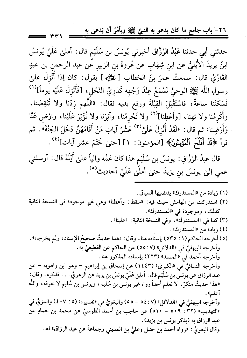 240 - أَخْبَرَنَا أَبُو عَبْدِ اللَّهِ الْحَافِظُ، أَخْبَرَنَا أَبُو عَبْدِ اللَّهِ مُحَمَّدُ بْنُ عَلِيٍّ الصَّنْعَانِيُّ بِمَكَّةَ، حَدَّثَنَا إِسْحَاقُ بْنُ إِبْرَاهِيمَ بْنِ عَبَّادٍ، أَخْبَرَنَا عَبْدُ الرَّازَّقِ، ح قَالَ: وَأَخْبَرَنَا أَحْمَدُ بْنُ جَعْفَرٍ الْقَطِيعِيُّ، حَدَّثَنَا عَبْدُ اللَّهِ بْنُ أَحْمَدَ بْنِ حَنْبَلٍ، حَدَّثَنِي أَبِي، حَدَّثَنَا عَبْدُ الرَّزَّاقِ، أَخْبَرَنِي يُونُسُ بْنُ سُلَيْمٍ، قَالَ: أَمْلَى عَلَيَّ يُونُسُ بْنُ يَزِيدَ الْأَيْلِيُّ، عَنِ ابْنِ شِهَابٍ، عَنْ عُرْوَةَ بْنِ الزُّبَيْرِ، عَنْ عَبْدِ الرَّحْمَنِ بْنِ عَبْدٍ الْقَارِيِّ، قَالَ: سَمِعْتُ عُمَرَ بْنَ الْخَطَّابِ، رَضِيَ اللَّهُ عَنْهُ يَقُولُ: كَانَ إِذَا أُنْزِلَ عَلَى رَسُولُ اللَّهِ صَلَّى اللهُ عَلَيْهِ وَسَلَّمَ الْوَحْيُ نَسْمَعُ عِنْدَ وَجْهُهِ كَدَوِيِّ النَّحْلِ، فَأُنْزِلَ عَلَيْهِ يَوْمًا فَسَكَتْنَا سَاعَةً، فَاسْتَقْبَلَ الْقِبْلَةَ وَرَفَعَ يَدَيْهِ فَقَالَ: «§اللَّهُمَّ زِدْنَا وَلَا تَنْقُصْنَا، وَأَكْرِمْنَا وَلَا تُهِنَّا، وَأَعْطِنَا وَلَا تَحْرِمْنَا، وَآثِرْنَا وَلَا تُؤْثِرْ عَلَيْنَا، وَارْضَ عَنَّا وَأَرْضِنَا» ثُمَّ قَالَ: «لَقَدْ أُنْزِلَ عَلَيْنَا عَشْرُ آيَاتٍ مَنْ أَقَامَهُنَّ دَخَلَ الْجَنَّةَ» ثُمَّ قَرَأَ {قَدْ أَفْلَحَ الْمُؤْمِنِونَ} [المؤمنون: 1] حَتَّى خَتَمَ عَشْرَ آيَاتٍ " قَالَ عَبْدُ الرَّزَّاقِ: وَيُونُسُ بْنُ سُلَيْمٍ هَذَا كَانَ عَمُّهُ وَالِيًا عَلَى أَيْلَةَ قَالَ: أَرْسَلَنِي عَمِّي إِلَيَّ يُونُسَ بْنِ يَزِيدَ حَتَّى أَمْلَى عَلَيَّ أَحَادِيثَ