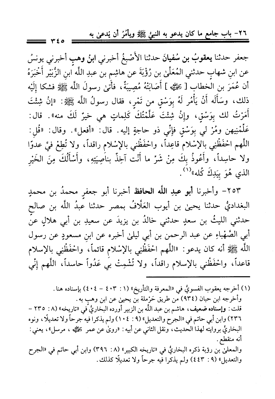 253 - أَخْبَرَنَا أَبُو عَبْدِ اللَّهِ الْحَافِظُ، أَخْبَرَنَا أَبُو جَعْفَرٍ مُحَمَّدُ بْنُ مُحَمَّدٍ الْبَغْدَادِيُّ، حَدَّثَنَا يَحْيَى بْنُ أَيُّوبَ الْعَلَّافُ، بِمِصْرَ، حَدَّثَنَا عَبْدُ اللَّهِ بْنُ صَالِحٍ، حَدَّثَنِي اللَّيْثُ بْنُ سَعْدٍ، حَدَّثَنِي خَالِدُ بْنُ يَزِيدَ، عَنْ سَعِيدِ بْنِ أَبِي هِلَالٍ، عَنْ أَبِي الصَّهْبَاءِ، عَنْ عَبْدِ الرَّحْمَنِ بْنِ أَبِي لَيْلَى، أَخْبَرَهُ، عَنِ ابْنِ مَسْعُودٍ، عَنْ رَسُولِ اللَّهِ صَلَّى اللهُ عَلَيْهِ وَسَلَّمَ أَنَّهُ كَانَ يَدْعُو: «§اللَّهُمَّ احْفَظْنِي بِالْإِسْلَامِ قَائِمًا، وَاحْفَظْنِي بِالْإِسْلَامِ قَاعِدًا، وَاحْفَظْنِي بِالْإِسْلَامِ رَاقِدًا، وَلَا تُشْمِتْ بِي عَدُوًّا حَاسِدًا، اللَّهُمَّ إِنِّي أَسْأَلُكَ مِنْ كُلِّ خَيْرٍ خَزَائِنُهُ بِيَدِكَ، وَأَعُوذُ بِكَ مِنْ كُلِّ شَرٍّ خَزَائِنُهُ بِيَدِكَ»