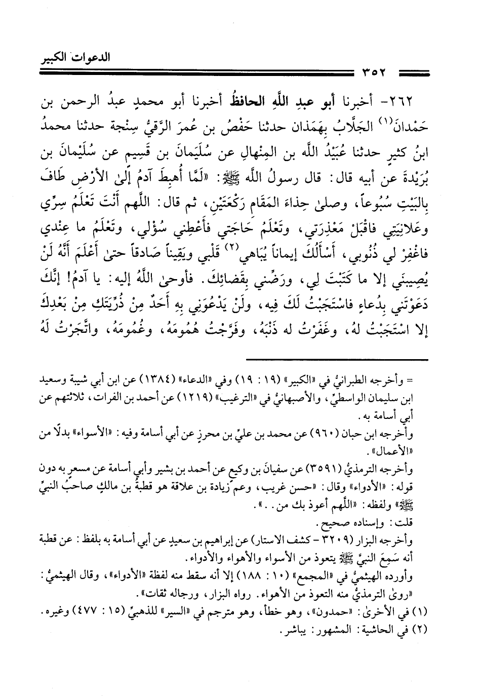 262 - أَخْبَرَنَا أَبُو عَبْدِ اللَّهِ الْحَافِظُ، أَخْبَرَنَا أَبُو مُحَمَّدِ بْنُ عَبْدِ الرَّحْمَنِ بْنِ حَمْدَانَ الْجَلَّابُ، بِهَمَدَانَ، حَدَّثَنَا حَفْصُ بْنُ عُمَرَ الرَّقِّيُّ سَنْجَةُ مُحَمَّدُ بْنُ كَثِيرٍ، حَدَّثَنَا عَبْدُ اللَّهِ بْنُ الْمِنْهَالِ، عَنْ سُلَيْمَانَ بْنِ قُسَيْمٍ، عَنْ سُلَيْمَانَ بْنِ بُرَيْدَةَ، عَنْ أَبِيهِ، قَالَ: قَالَ رَسُولُ اللَّهِ صَلَّى اللهُ عَلَيْهِ وَسَلَّمَ: §" لَمَّا أُهْبِطَ آدَمُ إِلَى الْأَرْضِ طَافَ بِالْبَيْتِ أُسْبُوعًا وَصَلَّى حِذَاءَ الْمَقَامِ رَكْعَتَيْنِ، ثُمَّ قَالَ: اللَّهُمَّ أَنْتَ تَعْلَمُ سِرِّي وَعَلَانِيَتِي فَاقْبَلْ مَعْذِرَتِي، وَتَعْلَمُ حَاجَتِي فَأَعْطِنِي سُؤَالِي، وَتَعْلَمُ مَا عِنْدِي فَاغْفِرْ لِي ذُنُوبِي، أَسْأَلُكَ إِيمَانًا يُبَاهِي قَلْبِي، وَيَقِينًا صَادِقًا حَتَّى أَعْلَمُ أَنَّهُ لَنْ يُصِيبَنِي إِلَّا مَا كَتَبْتَ لِي، وَرَضِّنِي بِقَضَائِكَ، فَأَوْحَى اللَّهِ إِلَيْهِ: يَا آدَمُ، إِنَّكَ دَعَوْتَنِي بِدُعَاءٍ فَاسْتَجَبْتُ لَكَ فِيهِ، وَلَنْ يَدْعُوَنِي بِهِ أَحَدٌ مِنْ ذُرِّيَّتِكَ مِنْ بَعْدِكَ إِلَّا اسْتَجَبْتُ لَهُ، وَغَفَرْتُ لَهُ ذَنْبَهُ، وَفَرَّجْتُ هَمَّهُ وَغُمُومَهُ، وَاتَّجَرْتُ لَهُ مِنْ وَرَاءِ كُلِّ تَاجِرٍ، وَأَتَتْهُ الدُّنْيَا رَاغِمَةً وَإِنْ كَانَ لَا يُرِيدُهَا "