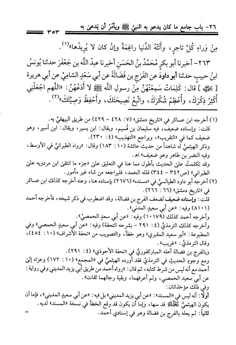 263 - أَخْبَرَنَا أَبُو بَكْرٍ مُحَمَّدُ بْنُ الْحَسَنِ، أَخْبَرَنَا عَبْدُ اللَّهِ بْنُ جَعْفَرٍ، حَدَّثَنَا يُونُسُ بْنُ حَبِيبٍ، حَدَّثَنَا أَبُو دَاوُدَ، عَنِ الْفَرَجِ بْنِ فَضَالَةَ، عَنْ أَبِي سَعْدٍ الشَّامِيِّ، عَنْ أَبِي هُرَيْرَةَ رَضِيَ اللَّهُ عَنْهُ قَالَ: كَلِمَاتٌ سَمِعْتُهُنَّ مِنْ رَسُولِ اللَّهِ صَلَّى اللهُ عَلَيْهِ وَسَلَّمَ، لَا أَدَعُهُنَّ: «§اللَّهُمَّ اجْعَلْنِي أُكْثِرُ ذِكْرَكَ، وَأُعَظِّمُ شُكْرَكَ، وَاتَّبِعُ نَصِيحَتَكَ، وَأَحْفَظُ وَصِيَّتَكَ»