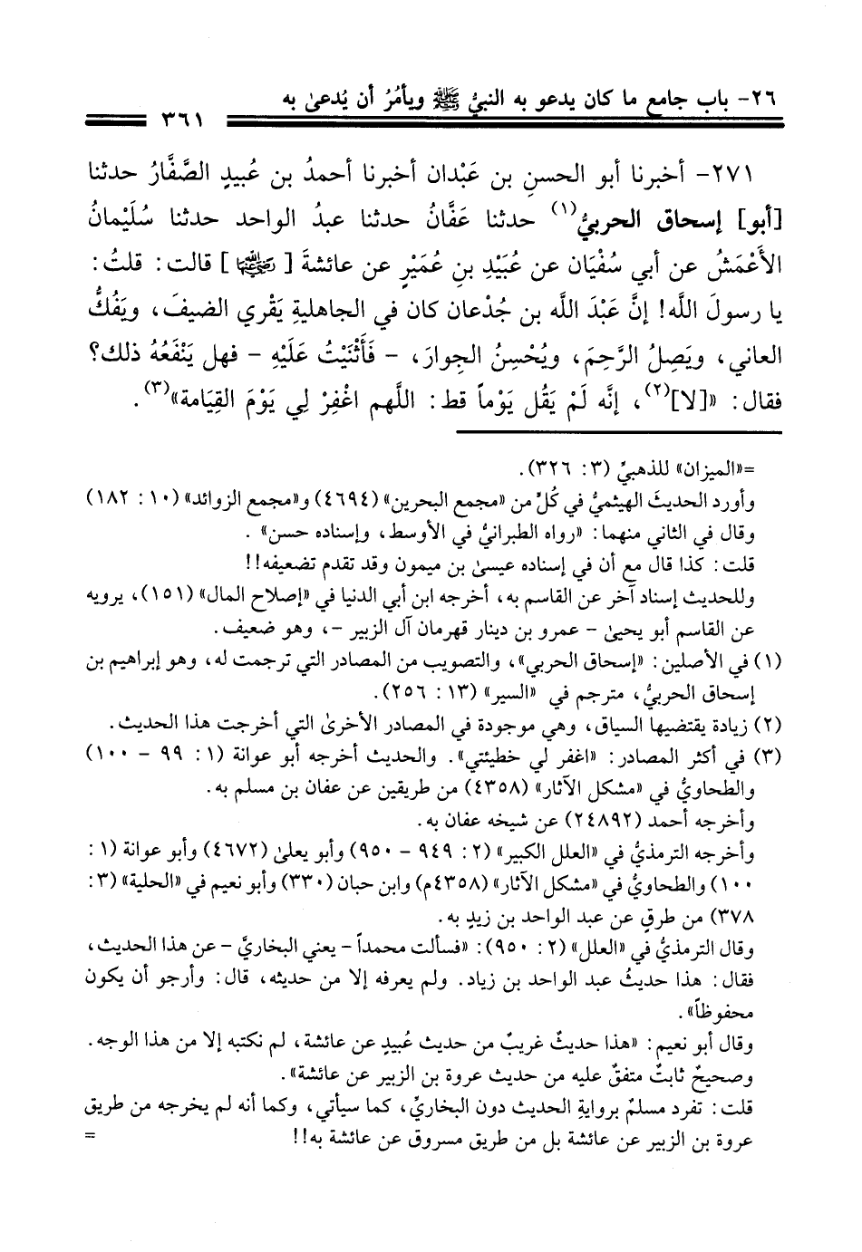 271 - أَخْبَرَنَا أَبُو الْحَسَنِ بْنُ عَبْدَانَ، أَخْبَرَنَا أَحْمَدُ بْنُ عُبَيْدٍ الصَّفَّارُ، حَدَّثَنَا أَبُو إِسْحَاقَ الْحَرْبِيُّ، حَدَّثَنَا عَفَّانُ، حَدَّثَنَا عَبْدُ الْوَاحِدِ، حَدَّثَنَا سُلَيْمَانُ الْأَعْمَشُ، عَنْ أَبِي سُفْيَانَ، عَنْ عُبَيْدِ بْنِ عُمَيْرٍ، عَنْ عَائِشَةَ رَضِيَ اللَّهُ عَنْهَا قَالَتْ: قُلْتُ: يَا رَسُولَ اللَّهِ، إِنَّ عَبْدَ اللَّهِ بْنَ جُدْعَانَ كَانَ فِي الْجَاهِلِيَّةِ يُقْرِي الضَّيْفَ وَيَفُكُّ الْعَانِيَ وَيَصِلُ الرَّحِمَ وَيُحْسِنُ الْجِوَارَ، فَأَثْنَيْتَ عَلَيْهِ، فَهَلْ يَنْفَعُهُ ذَلِكَ؟ فَقَالَ: " §لَا إِنَّهُ لَمْ يَقُلْ يَوْمًا قَطُّ: اللَّهُمَّ اغْفِرْ لِي يَوْمَ الْقِيَامَةِ "