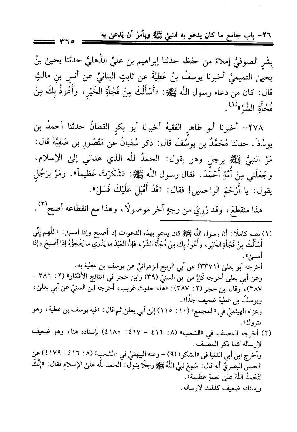 278 - أَخْبَرَنَا أَبُو طَاهِرٍ الْفَقِيهُ، أَخْبَرَنَا أَبُو بَكْرٍ الْقَطَّانُ، حَدَّثَنَا مُحَمَّدُ بْنُ يُوسُفَ، قَالَ: ذَكَرَ سُفْيَانُ عَنْ مَنْصُورِ ابْنِ صَفِيَّةَ، قَالَ: مَرَّ النَّبِيُّ صَلَّى اللهُ عَلَيْهِ وَسَلَّمَ بِرَجُلٍ وَهُوَ يَقُولُ: الْحَمْدُ لِلَّهِ الَّذِي هَدَانِي إِلَى الْإِسْلَامِ وَجَعَلَنِي مِنْ أُمَّةِ أَحْمَدَ فَقَالَ رَسُولُ اللَّهِ صَلَّى اللهُ عَلَيْهِ وَسَلَّمَ: «§شَكَرْتُ عَظِيمًا» وَمَرَّ بِرَجُلٍ يَقُولُ: يَا أَرْحَمَ الرَّاحِمِينَ , فَقَالَ: أَقْبَلَ عَلَيْكَ فَسَلْ " هَذَا مُنْقَطِعٌ، وَقَدْ رُوِيَ مِنْ أَوْجُهٍ أُخَرَ مَوْصُولًا , وَهَذَا مَعَ انْقِطَاعِهِ أَصَحُّ