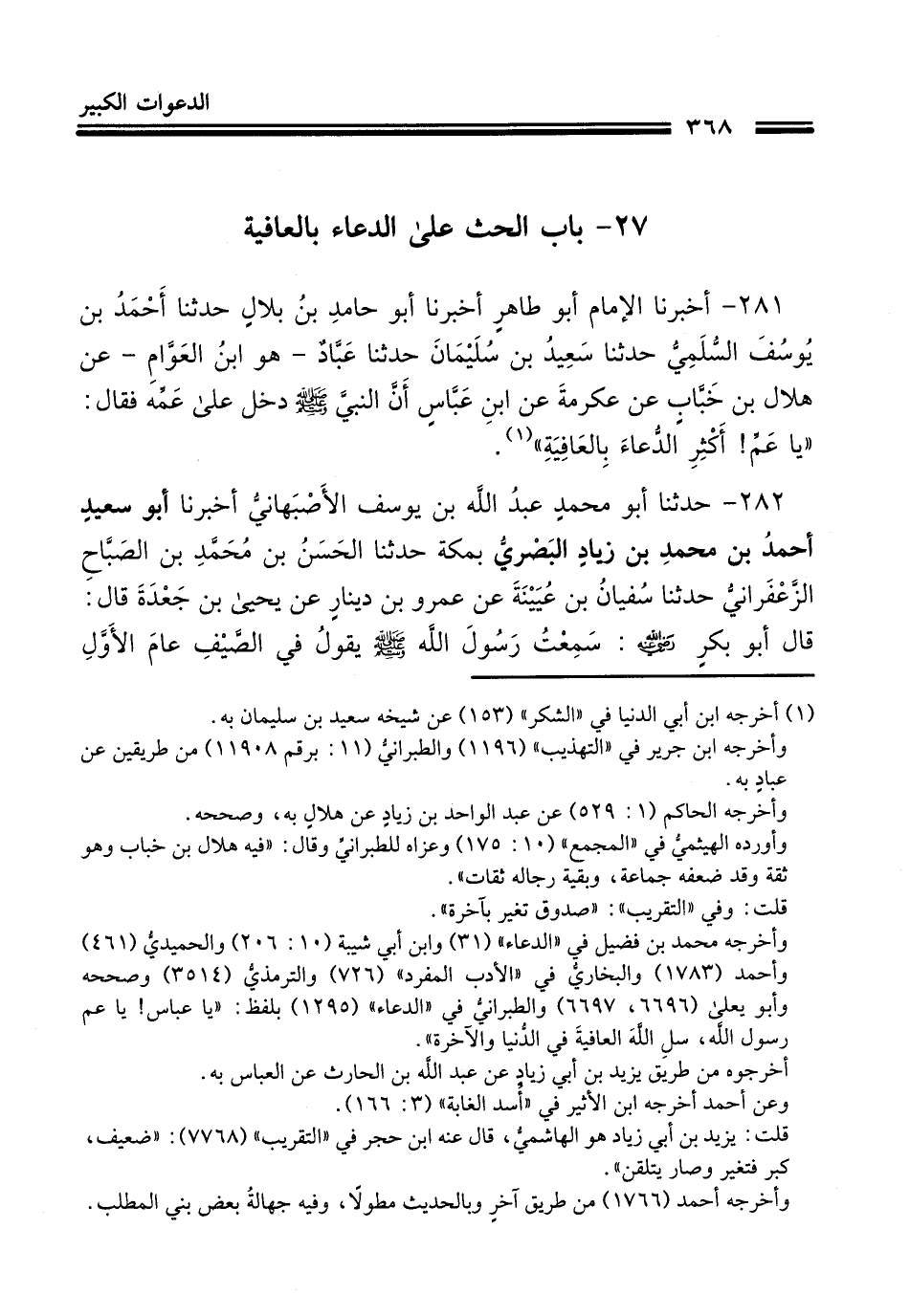 281 - أَخْبَرَنَا الْإِمَامُ أَبُو طَاهِرٍ، أَخْبَرَنَا أَبُو حَامِدِ بْنُ بِلَالٍ، حَدَّثَنَا أَحْمَدُ بْنُ يُوسُفَ السُّلَمِيُّ، حَدَّثَنَا سَعِيدُ بْنُ سُلَيْمَانَ، حَدَّثَنَا عَبَّادٌ هُوَ ابْنُ الْعَوَّامِ، عَنْ هِلَالِ بْنِ خَبَّابٍ، عَنْ عِكْرِمَةَ، عَنِ ابْنِ عَبَّاسٍ، أَنَّ النَّبِيَّ صَلَّى اللهُ عَلَيْهِ وَسَلَّمَ دَخَلَ عَلَى عَمِّهِ فَقَالَ: «يَا عَمِّ، §» أَكْثَرِ الدُّعَاءَ بِالْعَافِيَةِ "