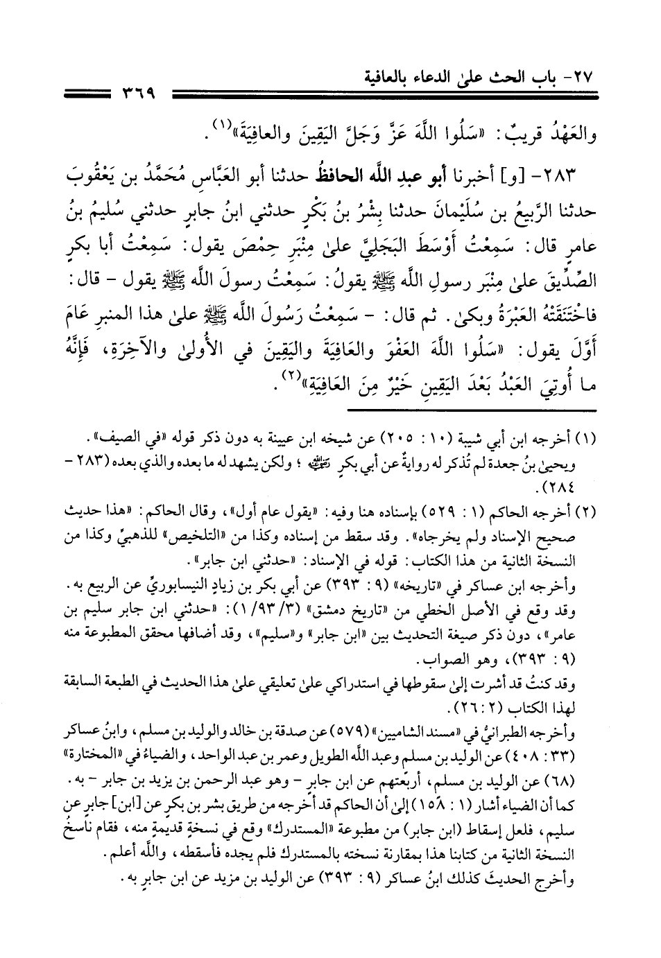 283 - وَأَخْبَرَنَا أَبُو عَبْدِ اللَّهِ الْحَافِظُ، حَدَّثَنَا أَبُو الْعَبَّاسِ مُحَمَّدُ بْنُ يَعْقُوبَ، حَدَّثَنَا الرَّبِيعُ بْنُ سُلَيْمَانَ، حَدَّثَنَا بِشْرُ بْنُ بَكْرٍ، حَدَّثَنِي سُلَيْمُ بْنُ عَامِرٍ، قَالَ: سَمِعْتُ أَوْسَطَ الْبَجَلِيَّ، عَلَى مِنْبَرِ حِمْصَ يَقُولُ: سَمِعْتُ أَبَا بَكْرٍ الصِّدِّيقَ، عَلَى مِنْبَرِ رَسُولِ اللَّهِ صَلَّى اللهُ عَلَيْهِ وَسَلَّمَ يَقُولُ سَمِعْتُ رَسُولَ اللَّهِ صَلَّى اللهُ عَلَيْهِ وَسَلَّمَ يَقُولُ: قَالَ: فَاخْتَنَقَتْهُ الْعَبْرَةُ وَبَكَى، ثُمَّ قَالَ: سَمِعْتُ رَسُولَ اللَّهِ صَلَّى اللهُ عَلَيْهِ وَسَلَّمَ عَلَى هَذَا الْمِنْبَرِ عَامَ أَوَّلَ يَقُولُ: §«سَلُوا اللَّهَ الْعَفْوَ وَالْعَافِيَةَ وَالْيَقِينَ فِي الْأُولَى وَالْآخِرَةِ فَإِنَّهُ مَا أُوتِيَ الْعَبْدُ بَعْدَ الْيَقِينِ خَيْرًا مِنَ الْعَافِيَةِ»
