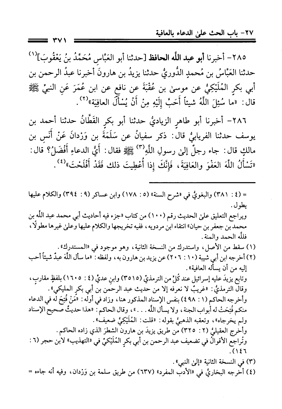 285 - أَخْبَرَنَا أَبُو عَبْدِ اللَّهِ الْحَافِظُ، حَدَّثَنَا أَبُو الْعَبَّاسِ مُحَمَّدُ بْنُ يَعْقُوبَ حَدَّثَنَا الْعَبَّاسُ بْنُ مُحَمَّدٍ الدُّورِيُّ، حَدَّثَنَا يَزِيدُ بْنُ هَارُونَ، أَخْبَرَنَا عَبْدُ الرَّحْمَنِ بْنُ أَبِي بَكْرٍ الْمُلَيْكِيُّ، عَنْ مُوسَى بْنِ عُقْبَةَ، عَنْ نَافِعٍ، عَنِ ابْنِ عُمَرَ، عَنِ النَّبِيِّ صَلَّى اللهُ عَلَيْهِ وَسَلَّمَ قَالَ: §«مَا سُئِلَ اللَّهُ شَيْئًا أَحَبَّ إِلَيْهِ مِنْ أَنْ يُسْأَلَ الْعَافِيَةَ»