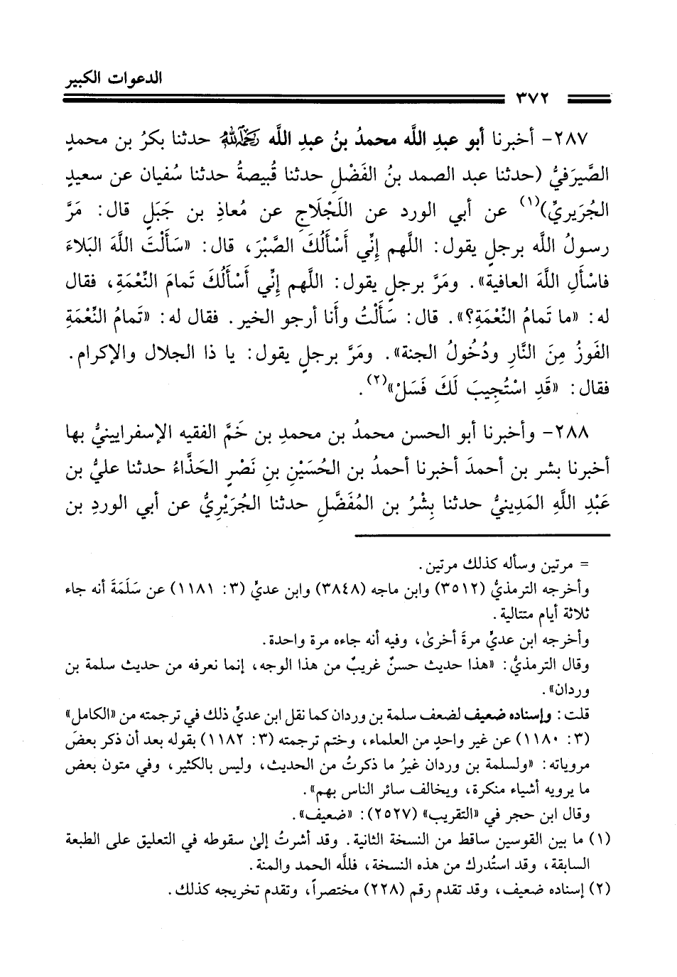 287 - أَخْبَرَنَا أَبُو عَبْدِ اللَّهِ مُحَمَّدُ بْنُ عَبْدِ اللَّهِ الْحَافِظِ رَحِمَهُ اللَّهُ، حَدَّثَنَا بَكْرُ بْنُ مُحَمَّدٍ الصَّيْرَفِيُّ، حَدَّثَنا عبد الصَّمَد بن الفض حَدَّثَنا قبيصة حَدَّثَنا سفيان عن سَعِيد الجريري عَنْ أَبِي الْوَرْدِ، عَنِ اللَّجْلَاجِ، عَنْ مُعَاذِ بْنِ جَبَلٍ، قَالَ: مَرَّ رَسُولُ اللَّهِ صَلَّى اللهُ عَلَيْهِ وَسَلَّمَ بِرَجُلٍ يَقُولُ: " §اللَّهُمَّ إِنِّي أَسْأَلُكَ الصَّبْرَ، قَالَ: «سَأَلْتَ اللَّهَ الْبَلَاءَ، فَاسْأَلِ اللَّهَ الْعَافِيَةَ» وَمَرَّ بِرَجُلٍ يَقُولُ: اللَّهُمَّ إِنِّي أَسْأَلُكَ تَمَامَ النِّعْمَةِ , فَقَالَ لَهُ: «مَا تَمَامُ النِّعْمَةِ؟» قَالَ: سَأَلْتُ وَأَنَا أَرْجُو الْخَيْرَ، فَقَالَ لَهُ: «تَمَامُ النِّعْمَةِ الْفَوْزُ مِنَ النَّارِ وَدُخُولُ الْجَنَّةِ» وَمَرَّ بِرَجُلٍ يَقُولُ: يَا ذَا الْجَلَالِ وَالْإِكْرَامِ، فَقَالَ: «قَدِ اسْتُجِيبَ لَكَ، فَسَلْ» .