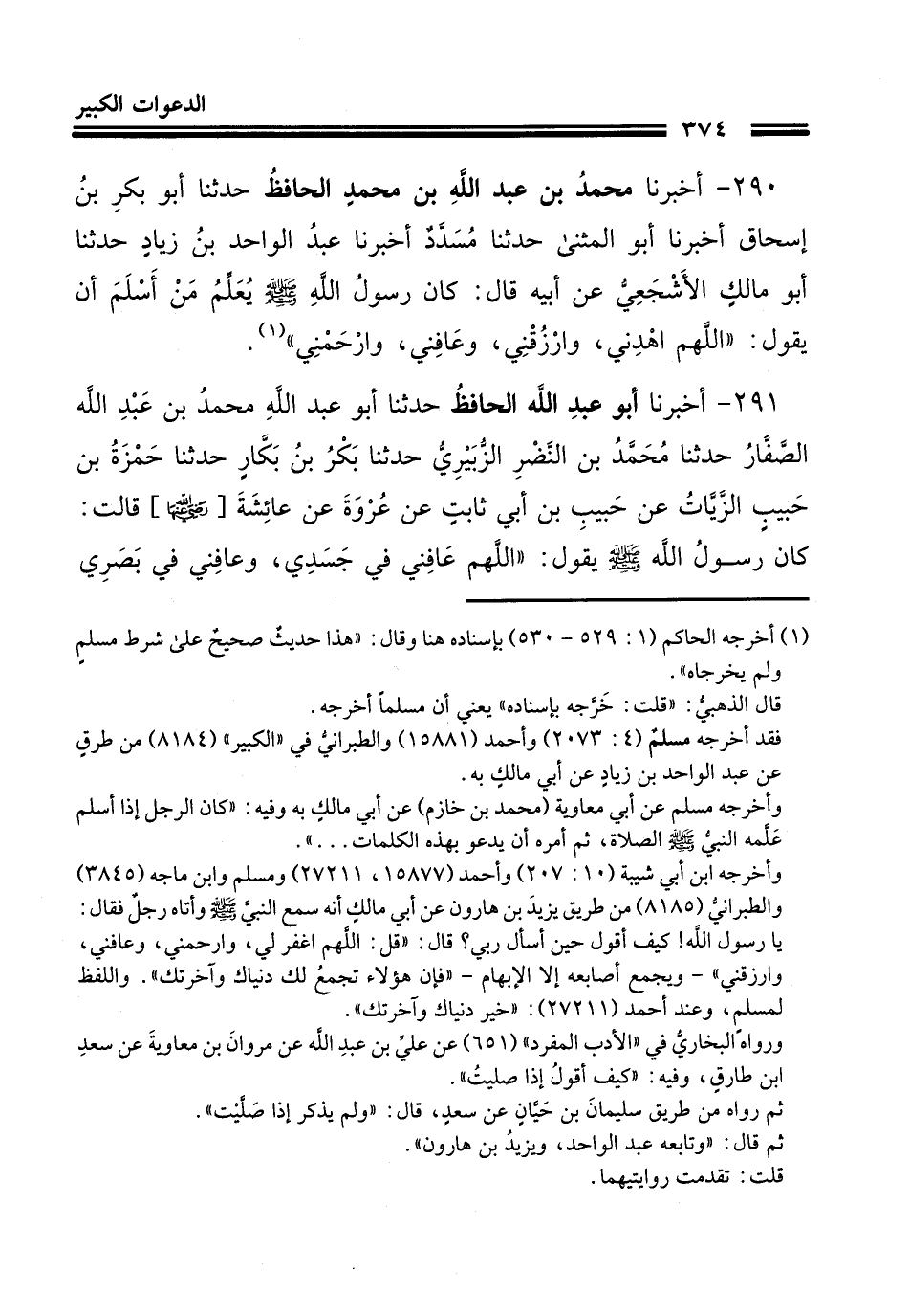 290 - أَخْبَرَنَا مُحَمَّدُ بْنُ عَبْدِ اللَّهِ بْنِ مُحَمَّدِ الْحَافِظُ، حَدَّثَنَا أَبُو بَكْرِ بْنُ إِسْحَاقَ، أَخْبَرَنَا أَبُو الْمُثَنَّى، حَدَّثَنَا مُسَدَّدٌ، أَخْبَرَنَا عَبْدُ الْوَاحِدِ بْنُ زِيَادٍ، حَدَّثَنَا أَبُو مَالِكٍ الْأَشْجَعِيُّ، عَنْ أَبِيهِ، قَالَ: كَانَ رَسُولُ اللَّهِ صَلَّى اللهُ عَلَيْهِ وَسَلَّمَ يُعَلِّمُ مَنْ أَسْلَمَ أَنْ يَقُولَ: «§اللَّهُمَّ اهْدِنِي، وَارْزُقْنِي، وَعَافِنِي، وَارْحَمْنِي»