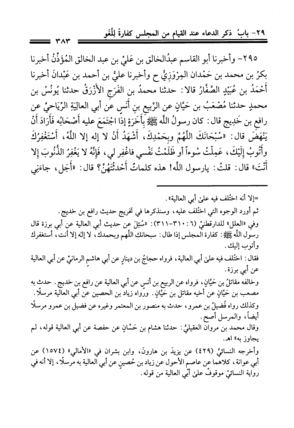 295 - وَأَخْبَرنا أبو القاسم عبد الخالق بن علي بن عبد الخالق المؤذن أَخْبَرنَا بكر بن محمد بن حمدان المروزي ح وَأَخْبَرنا علي بن أحمد بن عبدان أَخْبَرنَا أحمد بن عبيد الصفار قالا حَدَّثَنا محمد بن الفرج الأزرق حَدَّثَنَا يُونُسُ بْنُ مُحَمَّدٍ، حَدَّثَنَا مُصْعَبُ بْنُ حَيَّانَ، عَنِ الرَّبِيعِ بْنِ أَنَسٍ، عَنْ أَبِي الْعَالِيَةِ الرِّيَاحِيِّ، عَنْ رَافِعِ بْنِ خَدِيجٍ رضي الله عنه قَالَ: كَانَ رَسُولُ اللهِ صَلَّى اللهُ عَلَيْهِ وَسَلَّمَ بِأَخَرَةٍ إِذَا اجْتَمَعَ عليه أَصْحَابُهُ , فَأَرَادَ أَنْ يَنْهَضَ قَالَ: سُبْحَانَكَ اللَّهُمَّ وَبِحَمْدِكَ، أَشْهَدُ أَنْ لاَ إِلَهَ إِلاَّ الله، أَسْتَغْفِرُكَ وَأَتُوبُ إِلَيْكَ، عَمِلْتُ سُوءًا أو ظَلَمْتُ نَفْسِي، فَاغْفِرْ لِي، فإِنَّهُ لاَ يَغْفِرُ الذُّنُوبَ إِلاَّ أَنْتَ , قَالَ: قلت: يَا رَسُولَ اللهِ، هَذِهِ كَلِمَاتٌ أَحْدَثْتَهُنَّ؟ قَالَ: أَجَلْ، جَاءَنِي بهن جِبْرِيلُ عَلَيْهِ السَّلاَمُ , فَقَالَ: يَا مُحَمَّدُ، هُنَّ كَفَّارَاتُ الْمَجْلِسِ.