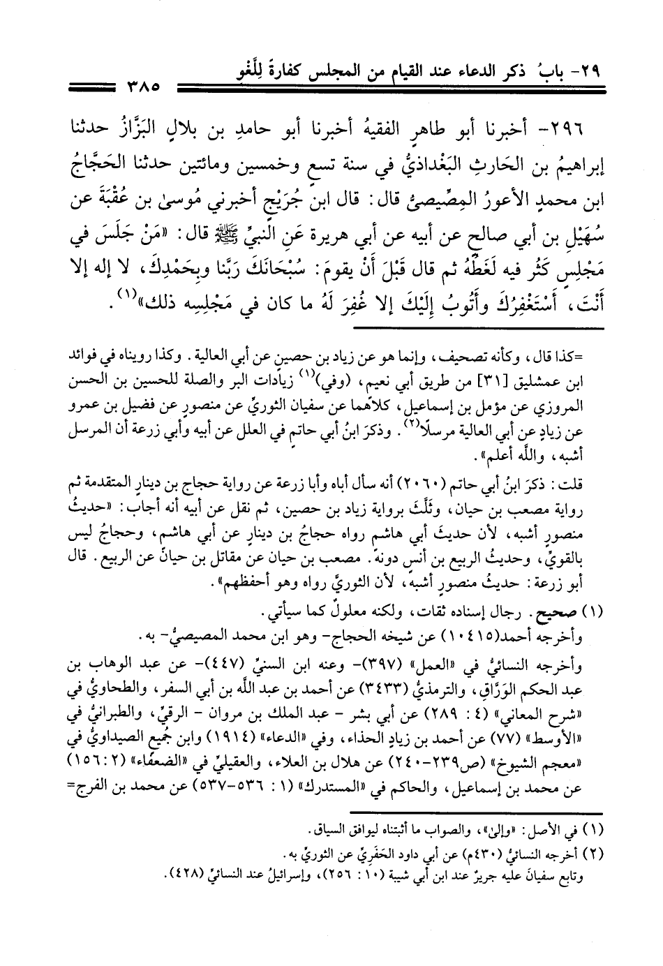 296 - أَخْبَرنَا أبو طاهر الفقيه أَخْبَرنَا أبو حامد بن بلال البزاز حَدَّثَنا إبراهيم بن الحارث البغدادي في سنة تسع وخمسين ومائتين , حَدَّثَنا الحجاج بن محمد الأعور المصيصي قال: قال ابْنُ جُرَيْجٍ: أَخْبَرَنِي مُوسَى بْنُ عُقْبَةَ، عَنْ سُهَيْلِ بْنِ أَبِي صَالِحٍ، عَنْ أَبِيهِ، عَنْ أَبِي هُرَيْرَةَ رضي الله عنه، عَنِ النَّبِيِّ صَلَّى اللهُ عَلَيْهِ وَسَلَّمَ قَالَ: مَنْ جَلَسَ فِي مَجْلِسٍ كَثُرَ فِيهِ لَغَطُهُ، ثُمَّ قَالَ قَبْلَ أَنْ يَقُومَ: سُبْحَانَكَ رَبَّنَا وَبِحَمْدِكَ، لاَ إِلَهَ إِلاَّ أَنْتَ، أَسْتَغْفِرُكَ وَأَتُوبُ إِلَيْكَ، إلا غُفِرَ لَهُ مَا كَانَ فِي مَجْلِسِهِ ذَلِكَ.