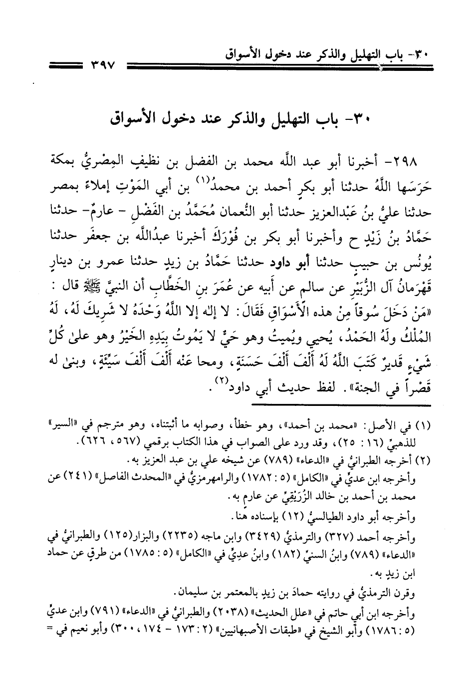 298 - أَخْبَرنَا أبو عبد الله محمد بن الفضل بن نظيف المصري بمكة حرسها الله حَدَّثَنا أبو بَكْر أحمد بن محمد بن أبي الموت إملاء بمصر حَدَّثَنا علي بن عبد العزيز حَدَّثَنا أبو النعمان محمد بن الفضل عارم حَدَّثَنَا حَمَّادُ بْنُ زَيْدٍ، ح وَأَخْبَرنا أبو بَكْر بن فورك أَخْبَرنَا عبد الله بن جعفر حَدَّثَنا يونس بن حبيب حَدَّثَنا أبو داود حَدَّثَنا حمَّاد بن زيد حَدَّثَنا عَمْرِو بْنِ دِينَارٍ قَهْرَمَانِ آلِ الزُّبَيْرِ، عَنْ سَالِمٍ، عَنْ أَبِيهِ، عَنْ عُمَرَ بْنِ الْخَطَّابِ، رَضِيَ اللَّهُ عَنْهُ، أَنَّ النَّبِيَّ صَلَّى الله عَلَيْهِ وَسَلَّمَ قَالَ: مَنْ دَخَلَ سُوقًا مِنْ هَذِهِ الأَسْوَاقِ فَقَالَ: لاَ إِلَهَ إِلاَّ اللَّهُ وَحْدَهُ لاَ شَرِيكَ لَهُ لَهُ الْمُلْكُ وَلَهُ الْحَمْدُ يُحْيِي وَيُمِيتُ وَهُوَ حَيٌّ لاَ يَمُوتُ بِيَدِهِ الْخَيْرُ وَهُوَ عَلَى كُلِّ شَيْءٍ قَدِيرٌ، كَتَبَ اللَّهُ عَزَّ وَجَلَّ لَهُ أَلْفَ أَلْفِ حَسَنَةٍ وَمَحَا عَنْهُ أَلْفَ أَلْفِ سَيِّئَةٍ وَبَنَى لَهُ قَصْرًا فِي الْجَنَّةِ.