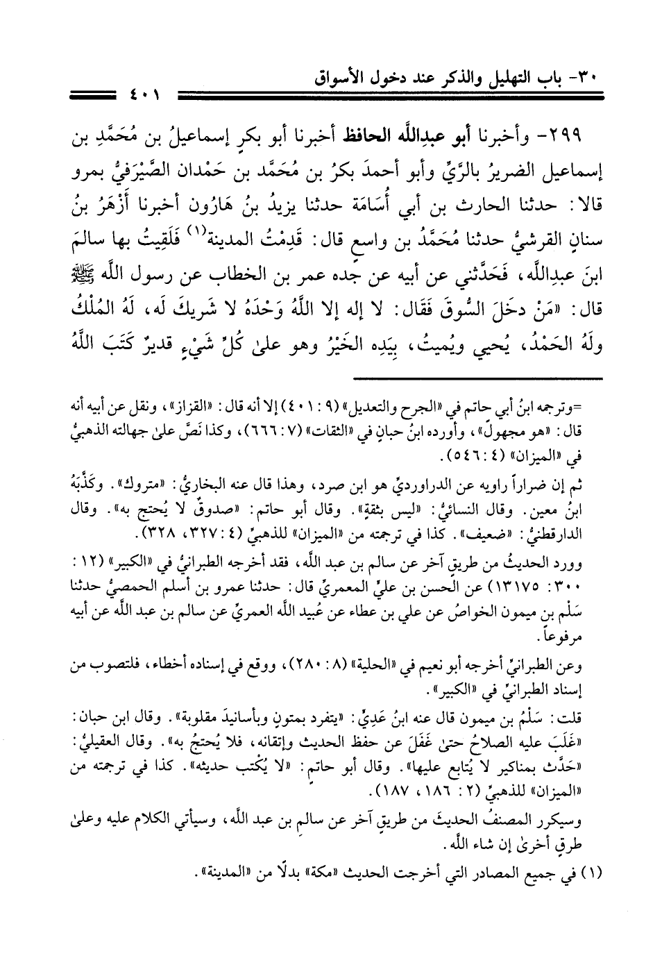 299 - وَأَخْبَرنا أبو عبد الله الحافظ أَخْبَرنَا أبو بَكْر إسماعيل بن محمد بن إسماعيل الضرير بالري وأبو أحمد بكر بن محمد بن حمدان الصيرفي بمرو قالا حَدَّثَنا الحارث بن أبي أسامة حَدَّثَنَا يَزِيدُ بْنُ هَارُونَ، أَخْبَرَنَا الأَزْهَرُ بْنُ سِنَانٍ القرشي حَدَّثَنا مُحَمَّدَ بْنَ وَاسِعٍ قال قَدِمْتُ مَكَّةَ فَلَقِيتُ بِهَا سَالِم بْنَ عَبْدِ اللهِ فحدثني عن أَبِيه عَنْ جَدِّه عمر بن الخطاب رضي الله عنه , عَنْ رَسُولِ اللهِ صَلَّى الله عَلَيْهِ وَسَلَّمَ: قَالَ مَنْ دَخَلَ السوق فَقَالَ لاَ إِلَهَ إِلا الله وَحْدَهُ لاَ شَرِيكَ لَهُ لَهُ الْمُلْكُ وَلَهُ الْحَمْدُ يُحْيِي وَيُمِيتُ , بِيَدِهِ الْخَيْرُ وَهُوَ عَلَى كُلِّ شَيْءٍ قَدِيرٌ , كَتَبَ الله لَهُ أَلْفَ أَلْفِ حَسَنَةٍ , وَحَطَّ عَنْهُ أَلْفَ أَلْفِ سَيِّئَةٍ , وَرَفَعَ لَهُ أَلْفَ أَلْفِ دَرَجَةٍ , وبنى له بيتا في الجنة قَالَ فَقَدِمْتُ خُرَاسَانَ فَلَقِيتُ قُتَيْبَةَ بْنَ مُسْلِمٍ فَقُلْتُ له أتيتك بِهَدِيَّةٍ فَحَدَّثْتُهُ بالْحَدِيث فَكَانَ قتيبة بن مسلم يَرْكَبُ فِي مَوْكِبِهِ حتى يأتي باب السُّوقَ فَيَقُولُهَا ثُمَّ يَنْصَرِفُ.