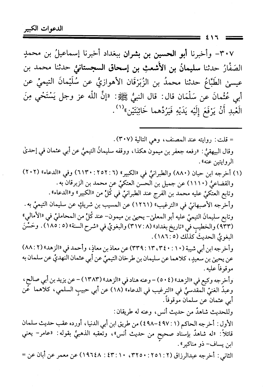 307 - وَأَخْبَرَنَا أَبُو الْحُسَيْنِ بْنُ بِشْرَانَ، بِبَغْدَادَ، أَخْبَرَنَا إِسْمَاعِيلُ بْنُ مُحَمَّدٍ الصَّفَّارُ، حَدَّثَنَا سُلَيْمَانُ بْنُ الْأَشْعَثَ بْنِ إِسْحَاقَ السِّجِسْتَانِيُّ، حَدَّثَنَا مُحَمَّدُ بْنُ عِيسَى الطَّبَّاعُ، حَدَّثَنَا مُحَمَّدُ بْنُ الزِّبْرِقَانِ الْأَهْوَازِيُّ، عَنْ سُلَيْمَانَ التَّيْمِيِّ عَنْ أَبِي عُثْمَانَ، عَنْ سَلْمَانَ، قَالَ: قَالَ النَّبِيُّ صَلَّى اللهُ عَلَيْهِ وَسَلَّمَ: «إِنَّ §» اللَّهَ عَزَّ وَجَلَّ يَسْتَحِي مِنَ الْعَبْدِ أَنْ يَرْفَعَ إِلَيْهِ يَدَيْهِ فَيَرُدَّهُمَا خَائِبَتَيْنِ "